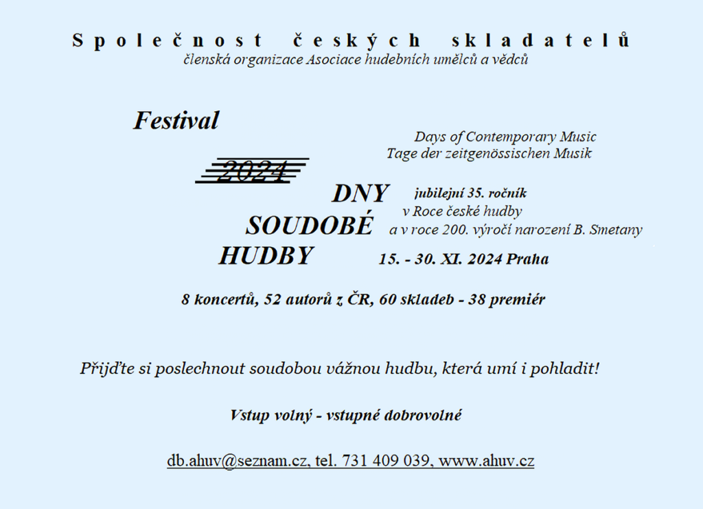 Pražský festival Dny soudobé hudby letos prožije jubilejní 35. ročník. V termínu od 15. listopadu do konce měsíce zazní na šedesát skladeb od dvaapadesáti autorů a k slyšení bude celkem 37 premiér, z toho jednadvacet světových. Přehlídku pořádá Společnost českých skladatelů, členská organizace Asociace hudebních umělců a vědců. Vstup na koncerty je volný.