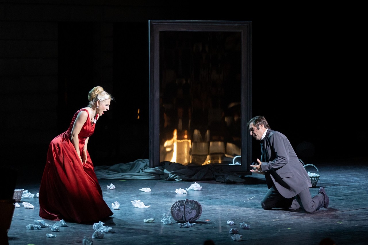 Ani druhý litomyšlský večer Janáčkovy opery z Brna neutrpěl přesazením z Janáčkova divadla na úplně jiné jeviště s minimálním technickým vybavením. Jak se ukázalo, scénografická kouzla, která v Brně dotvářejí inscenaci Evžena Oněgina, jsou skvělá a vůbec nic proti nim. Avšak i bez nich, v oproštěném základu, klasická hra, jak ji přehledně Martin Glaser režijně vede, naprosto a dostatečně funguje. Motivace, charaktery, emoce.. vše je vyhmátnuto jasně, chvílemi civilně a reálně, chvílemi v pozastavení a zdůrazněném nasvícení symbolicky a poeeticky, po celý večer v rovnováze obou poloh. Hry se zrcadly se na rozdíl od jiných nápadů inscenátoři zřeknout ani v podmínkách letního festivalu nemuseli. Je to prvek dynamický i symbolicky působivý.