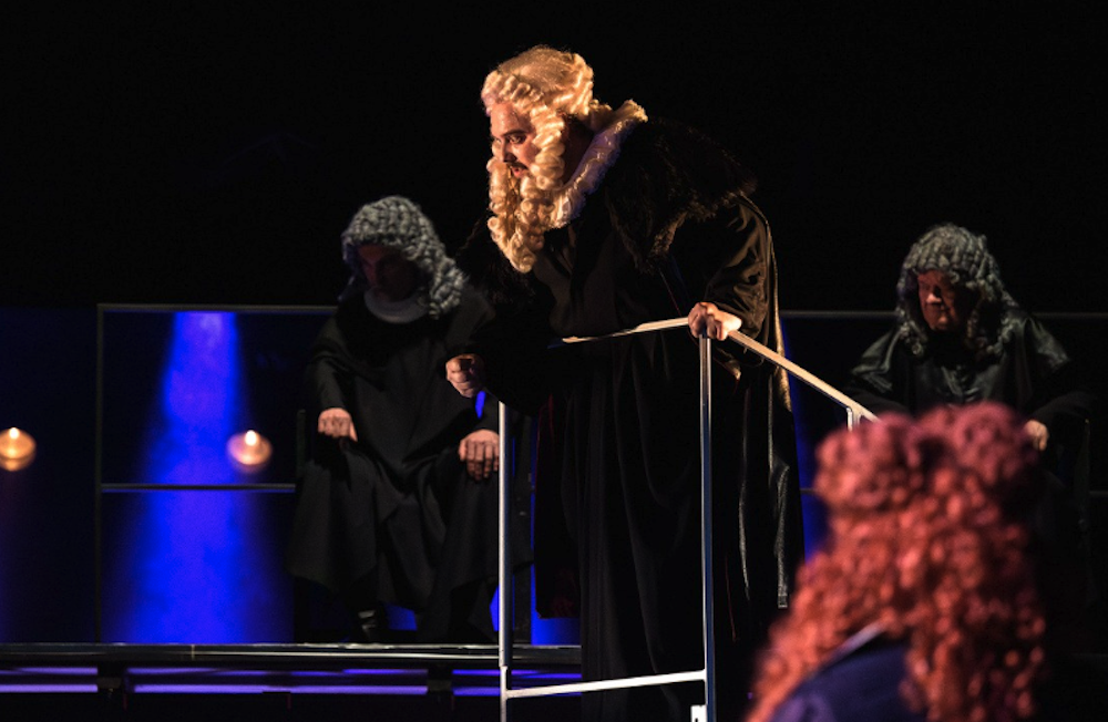 Martin Otava (předpremiérový rozhovor čtěte ZDE), který se tentokrát kromě režie ujal i scénického ztvárnění, záměrně volil jednoduchou scénu, v níž použil černé plexisklové stěny a „svobodovský“ zrcadlový strop. Poněkud schematicky působila úvodní projekce volně poletujícího ptáka a vlajícího obilí pod rudě zbarvenou oblohou. Tuto červeň diváci mohou chápat jako symbol prolité krve, jiní jako jeho symbol Chodska (je to právě červená, která má ze všech barev v chodském dialektu nejvíce výrazů!). Scénu apelačního soudu režisér pojal téměř à la Fellini, když jeho předsedu Václava hraběte ze Šternberka pojal jako monstrum kroužící na vysokých točitých schůdkách na okraji točny. Nicméně hostující Michael Kubečka se své role v této náročné pozici ujal znamenitě!