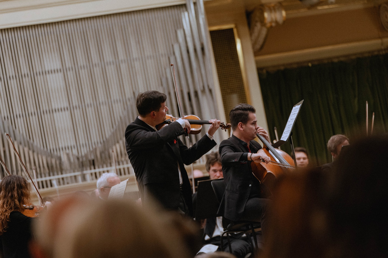 Po přestávce nastoupil velký orchestr, aby provedl Koncert pro housle, violoncello a orchestr a moll, op.102 Johannesa Brahmse. Skladatel, od jehož narození uplynulo letos 190 let, byl skalním zastáncem absolutní hudby a jeho invence byla nevyčerpatelná; hudební proud si hýčká napětí i při užití kontrastních ploch a zužitkování veškerých barev nástrojů. Partu houslí se ujal Roman Patočka a violoncella Václav Petr, oba výsostní umělci, dokonale se doplňující, ovládající nejen brilantně své nástroje, ale především se ideálně doplňující jako interpreti. Navíc se jejich nástroje dokonale pojily barevně i dynamicky, plynule přecházely mezi jednotlivými frázemi, jež poté umělci společně rozvíjeli do virtuózně pojatých hudebních sdělení. A to jak v první větě Allegro, kde laškovali mezi sebou i s orchestrálními plochami, tak ve druhé větě Andante, kde si užívali kantabilních částí, jež zněly sladce i naléhavě, tak zejména v závěrečném Vivace non troppo v radostně rytmizované melodii, kterou si vychutnal nejen orchestr a sólisté, ale především posluchači. Nadšení bylo znát i na projevu orchestru a přiživoval ho dirigent Robert Kružík. Podněcoval hráče energicky a s muzikantským zápalem k maximálnímu výkonu. A to i přesto, že velký orchestr v sále Besedního domu je zvukově předimenzovaný a jen díky znalosti prostředí dokáží hudebníci i dirigent najít tu správnou míru dynamiky.