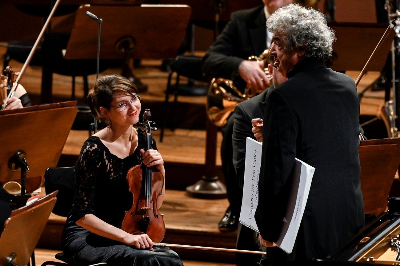 Nejdříve je na programu česká premiéra Koncertu pro dva klavíry a orchestr Američana Bryce Dessnera, úspěšného čtyřicátníka s rockovým zázemím, autora písní, hudby k tanečnímu divadlu i k filmům a nakonec i koncertních skladeb. Jako skladatel vážné hudby se poprvé představil na albu Aheym. Hraje na něm i proslavené nekonvenční Kvarteto Kronos. Dessner, usazený v Paříži, přiznává řadu vlivů, mimo jiné z hudby Oliviera Messiaena, Francise Poulenca nebo Henriho Dutilleuxe. Koncert pro dva klavíry napsal pro sestry Katiu a Marielle Labèqueovy, které dílo poprvé hrály v dubnu 2018 společně s London Philharmonic Orchestra.