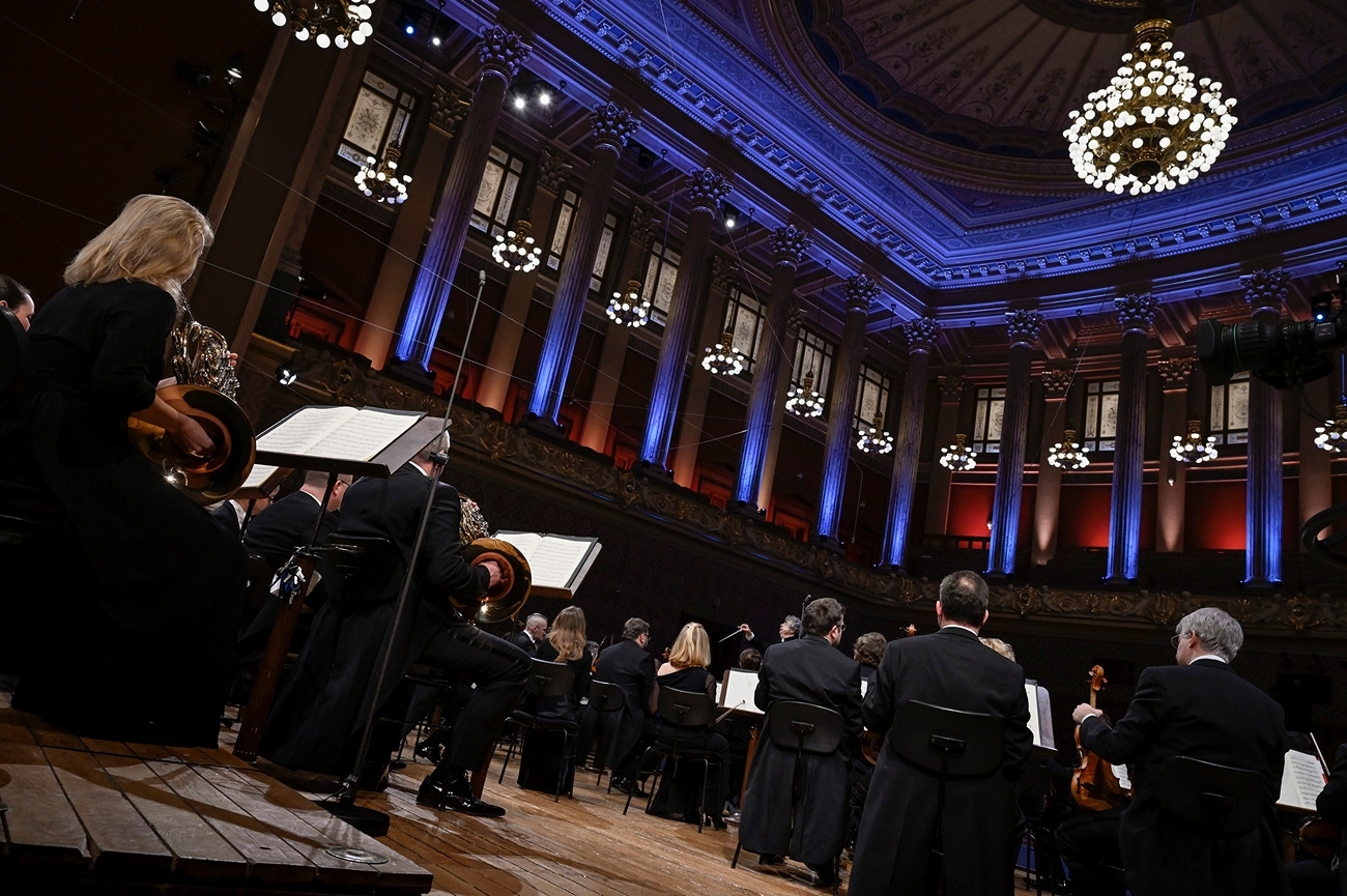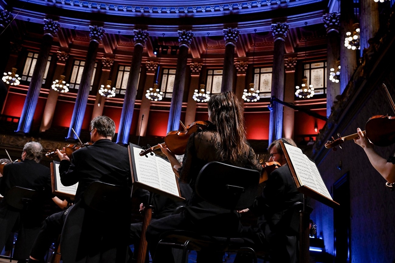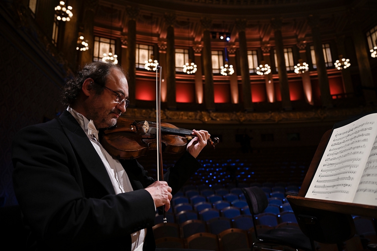 Živě streamované online koncerty mívají téměř vždy menší formát. I tento čtvrteční je, s krátkou přestavbou, naplánován na něco mezi sedmdesáti a osmdesáti minutami. Ve zvýrazněném okamžiku, na plně nasvíceném pódiu a ve fracích, vypadají a hrají filharmonici jako při regulérním koncertě. Jen ten šum v sále, potlesk, povstání všech na konci, odchody a příchody děkujících se sólistů a dirigenta chybějí… Jako na place při filmování: nezvýrazněný příchod, soustředění, vyčkávání, pomyslná klapka, proměna do naučené, i když spontánně hrané role… a po doznění hudby a zhasnutí reflektorů uvolnění k civilnímu chování. Diváka zastupuje kamera. Když nesvítí „červená“ a její čočky se tedy nedívají, veřejné představení nepokračuje a na pódium se s naprostou samozřejmostí vkrádá zákulisí.