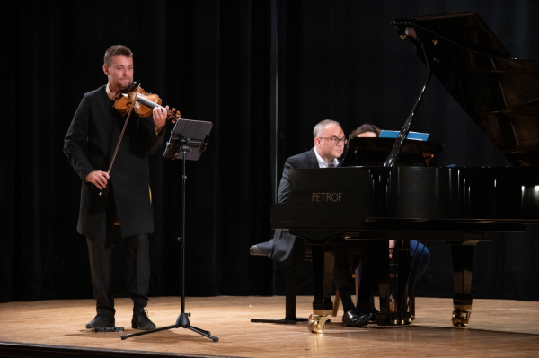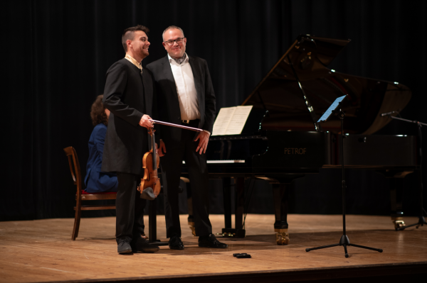 Po přestávce se rozezněla půvabná Sonatina pro housle a klavír, op. 100, která vznikla v roce 1893 v New Yorku během druhého školního roku Dvořákova působení na tamější konzervatoři. Mistr nepochybně vnímal jubilejní opusové číslo jako výzvu, kterou naplnil nejen láskyplnou osobní dedikací „mým dítkům“, ale také svěží a radostnou hudbou. Jiří Vodička má pro dětskou duši pochopení. Dokáže ztvárnit bezstarostnou melodii s patřičnou rozpustilostí a žertovnou nadsázkou. Umí vystihnout jemné nuance a odstupňovat emoce, které vedou od lehkého úsměvu na rtech k smíchu z plných plic. To vše mohli posluchači číst v jeho průzračném houslovém podání, které klavírista Mareček podpořil svým promyšleným klavírním doprovodem a doslova mazlivým úhozem.