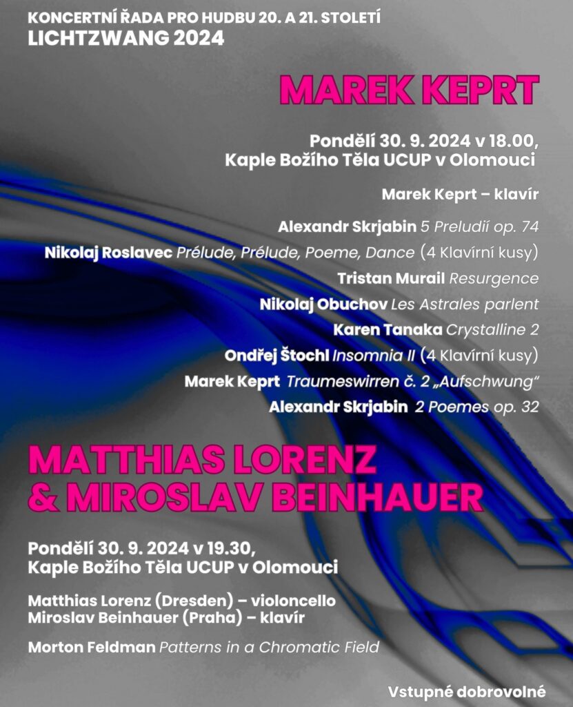 Koncertní řada pro hudbu dvacátého a jednadvacátého století olomouckého ansámblu Lichtzwang nabídne v pondělí 30. září dvojici koncertů. V olomoucké Kapli Božího Těla v Uměleckém centru Univerzity Palackého vystoupí od osmnácti hodin klavírista Marek Keprt a o hodinu a půl později violoncellista Matthias Lorenz s klavíristou Miroslavem Beinhauerem. 3. října zamíří Marek Keprt do Prahy, kde jej čeká recitál v žižkovském Atriu.