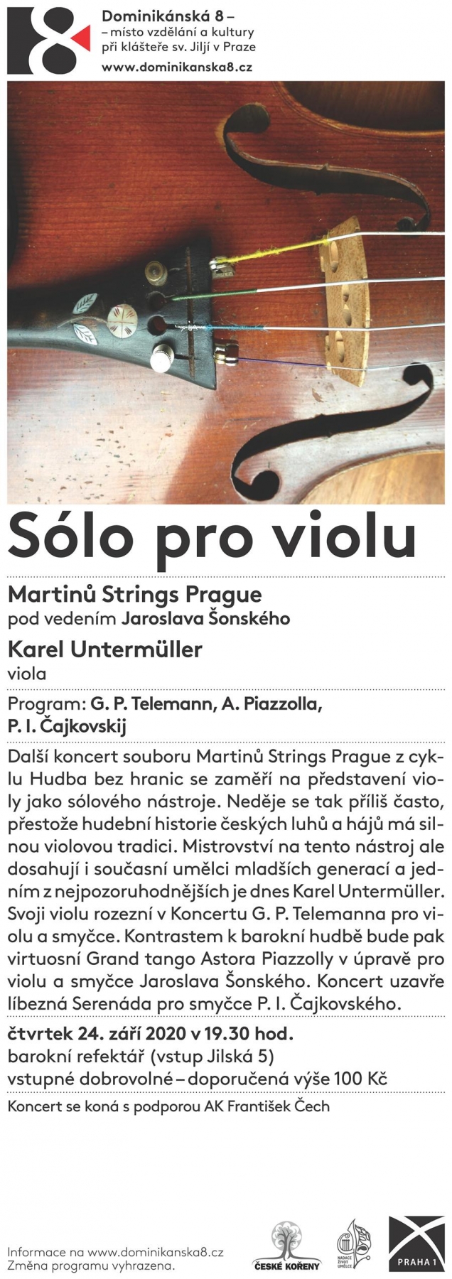 Pražský cyklus Hudba bez hranic zahájí čtvrtečním koncertem (24. 9.) v barokním refektáři dominikánů v Jilské ulici svou dvanáctou sezónu. Dvanáctičlenný komorní smyčcový orchestr Martinů Strings Prague, který založil a vede houslista Jaroslav Šonský, přizval ke spolupráci violistu Karla Untermüllera. Ten svůj nástroj rozezní v Koncertu pro violu a smyčce Georga Philippa Telemanna. Kontrastem k baroknímu Concertu grossu Georga Friedricha Händela a baroknímu violovému koncertu pak bude virtuosní Grand tango Ástora Piazzolly v úpravě pro violu a smyčce Jaroslava Šonského.