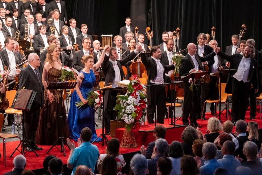 Českou filharmonii chápeme vždy a v každé době jako český etalon kvality ve hře symfonického orchestru. Proto na ni máme vždy velké nároky. Po náročném vstupním koncertu v úmorném vedru, dopolední zkoušce oratoria, opět v dusnu horkého dne, bylo pochopitelné, že se jistá malá míra útlumu dostaví. Pianissimo, atraktivně dirigentem prezentované hned v první vstupní části, sice bylo imponujícím pianissimem, ale ne zcela zvukem naplněné. Postupně se však začalo naplňovat, homogenita zvuku celku stále zřetelně narůstala. Ve vstupu do druhé části večera, v introdukci k altové árii, předvedl orchestr ukázkový dynamický moment pružného zesílení a zeslabení hudební fráze v houslových skupinách, v agogice frází reagoval na gesto dirigenta znamenitě. Parádním momentem ukázky plasticity fráze bylo místo sóla skupiny violoncell. Ve druhé polovině večera již Česká filharmonie předváděla svoji typickou zvukovou měkkost a kultivovanost plastických hudebních frází, doprovázela sólisty pod Hrůšovým vedením neobyčejně dynamicky citlivě. Nikde nepřekrývala sólisty, ani v hlubokých polohách. Kéž by toto bylo běžné v české opeře! Hrůša zřetelně šetřil dynamikou, aby si plná forte a fortissima zachoval pro důležité vrcholy. Tím mu právě vyšel závěr kompozice dynamicky impozantně, filharmonici prokázali plně své technické kvality ve skupině dřevěných dechových nástrojů a žesťů, homogenita zvuku celku se sborem a sólisty byla imponující. Bravo! Publikum náležitě ocenilo výkon oprávněnými, dlouho trvajícími ovacemi vestoje. Byl jsem svědkem večera, na který se dlouho nezapomíná.