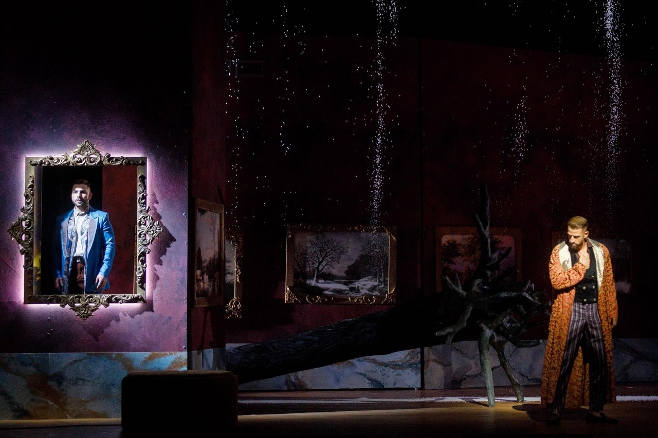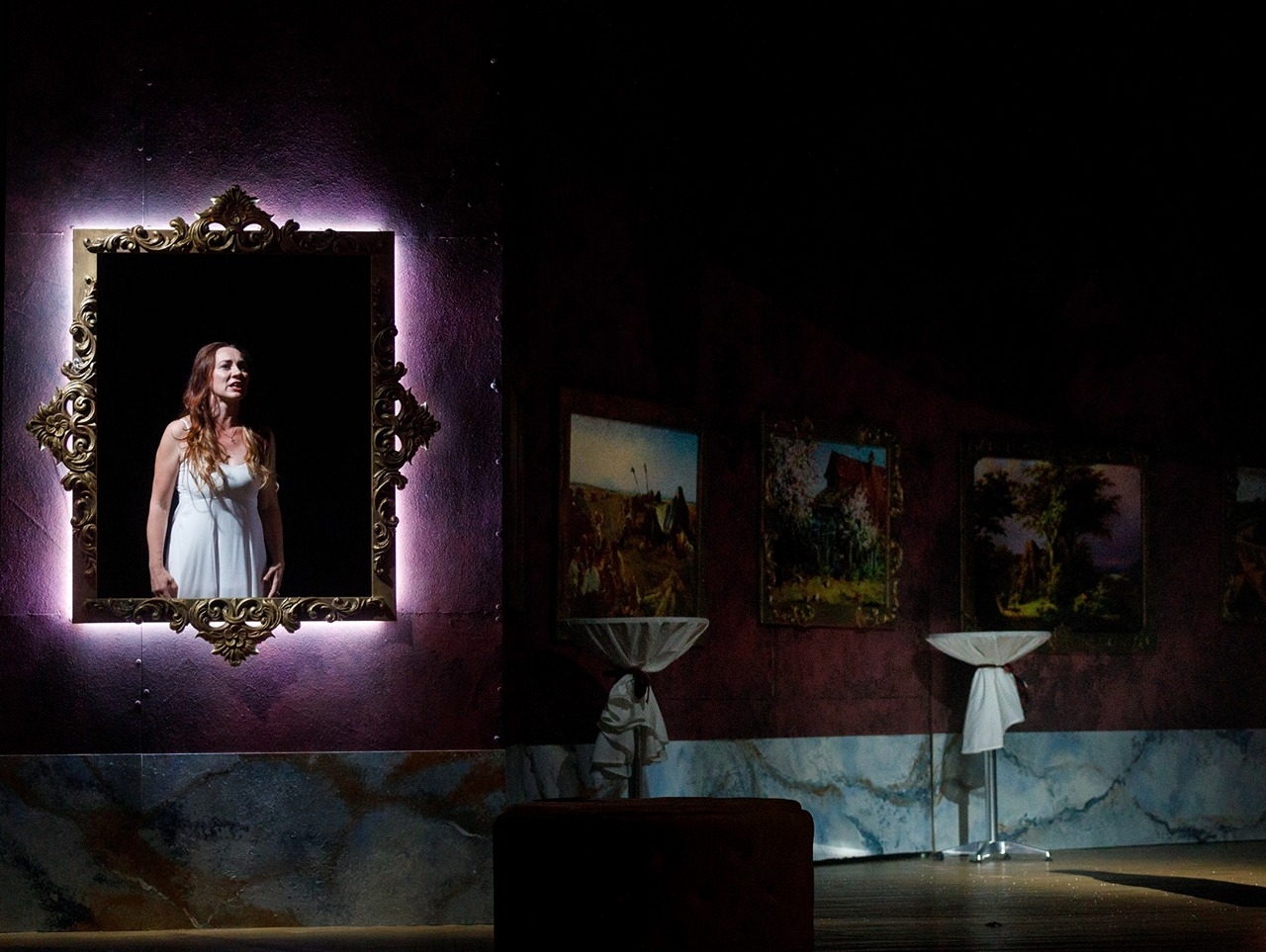 První třetina inscenace, utopená ve tmě, na mne působila paradoxně depresivně. Proč? Při ukázce spontánního ruského folkloru, plného radosti a jasu, zářivé přirozenosti oproti přetvářce a klamu oné „vyšší“ společnosti? Je snad nepatřičné vidět na jevišti radost, jas, spontánnost, plamen lásky? Sbor místo toho, k čemu je skladatelem předurčen, se topí ve tmě, v černých róbách, je dirigován jako na zkoušce. Naprosto mimo smysl partitury, mimo snahu skladatele a jeho nádherné hudby. Vše se odehrává v jakési galerii. To samo o sobě lze ještě akceptovat, ale k tomu neustálá tma na jevišti snad nemusí souviset s vizí galerie, s obrazem Taťány, který se stává jakousi idée fixe a základem pro odvíjení snové fantazie. Někdy je snění pochopitelné, jinde méně, neb hudba je v opeře primární, z ní se má vše odvíjet. Ač je v programu nástin režisérem stručně vysvětlen, což si ale málokdo přečte před přestavením, nepotřebuji zdůvodnění, proč činím tu či onu zvláštnost. Pokud něco v roli režiséra činím, musí to být na jevišti srozumitelné, ne abych studoval v programu, co čím někdo chtěl říci. Dlužno spravedlivě dodat, že režisér v půdorysu stále přítomné obrazárny nezatratil taneční scény, za což jsem mu vděčen. V Linci, roku 2018, jsem byl překvapen absencí baletu a všech tanců. Optal jsem se proto už na generálce pana režiséra, proč tomu tak je, co to má za smysl, ostatně byl skupinou ruských turistů na premiéře vybučen… „Chci, aby se posluchač soustředil na Taťánu a Oněgina, proto jsem žádal, aby balet vypadl z Oněgina jako první,“ pravil mi pan režisér. Taková míra vidění Puškina a Čajkovského prostě ohromí. Vztahu hlavních hrdinů překážel hlavně balet… Režiséři jsou dnes v opeře zvláštní sorta jedinců. Nedávno mi vyprávěl jeden znamenitý dirigent, jak spolupracoval s režisérem, který vůbec neznal noty, kterak se těžko mohli spolu na čemkoliv domluvit…