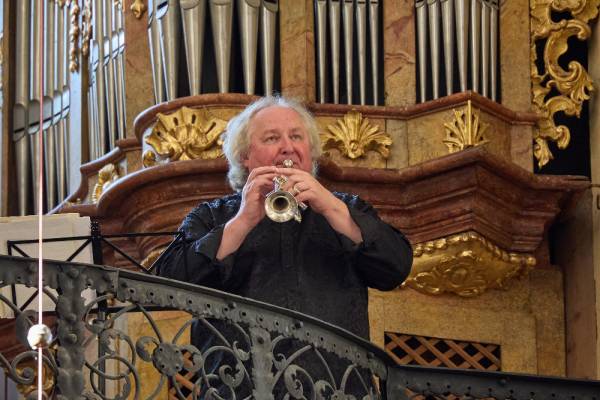 Trumpetista Reinhold Friedrich patří ke světově uznávaným interpretům především barokního repertoáru, ale nevyhýbá se ani novějším obdobím, včetně hudby současné. Přes své vytížení na mnoha světových pódiích bývá hostem i v České republice, kromě spolupráce např. s Janáčkovou filharmonií Ostrava vystoupil v uplynulé koncertní sezóně s Komorní filharmonií Pardubice, před dvěma lety působil i jako lektor na mistrovských kurzech Czech Brass Academy Praha. Pedagogicky působí na Hochschule für Musik v Karlsruhe, ovšem své jednorázové „masterclassy“ pořádá prakticky po celém světě. Důkazem jeho proslulosti a respektu k němu bylo i složení publika v kukském kostele, které zahrnovalo neuvěřitelné množství našich předních trumpetistů. To vytvořilo velmi milou a pospolitou atmosféru, na kterou svým nezaměnitelně sympatickým způsobem Reinhold Friedrich očividně reagoval, ostatně to vyjádřil již prostřednictvím svého krátkého úvodního proslovu. Na úvod svého vystoupení zvolil tři z osmi jednovětých Sonát pro trubku a varhany Girolama Fantiniho (1600–1675). Tento trubač na dvoře velkovévody toskánského spolupracoval s Girolamem Frescobaldim, se kterým vytvořil kolem roku 1650 první historicky doložené koncertní spojení varhan a trubky. Reinhold Friedrich Fantiniho sonáty interpretoval obdivuhodným způsobem na barokní clarinu, tedy nástroj bez jakékoliv mechaniky, využívající pouze alikvotní tóny a to s naprostou technickou i intonační suverenitou, což zasvěcené publikum odměnilo bouřlivým potleskem. Pro ostatní vstupy pak použil sólista pístové piccolo trubky, což platilo i pro excelentní provedení Sonáty g moll pro trubku a varhany Pavla Josefa Vejvanovského (1640–1693), která v našem českém prostředí patří k jedné z nejpopulárnějších skladeb, spojující s nápaditou invencí souzvuk trubky s varhanami. Vejvanovského sonátě předcházela kompozice rovněž z českého prostředí, kratší varhanní Fuga D dur Bohuslava Matěje Černohorského (1684 – 1742), kterou interpretka dokázala i díky zvukově příjemnému plénu kukských varhan a rytmické preciznosti podat s působivou přesvědčivostí.