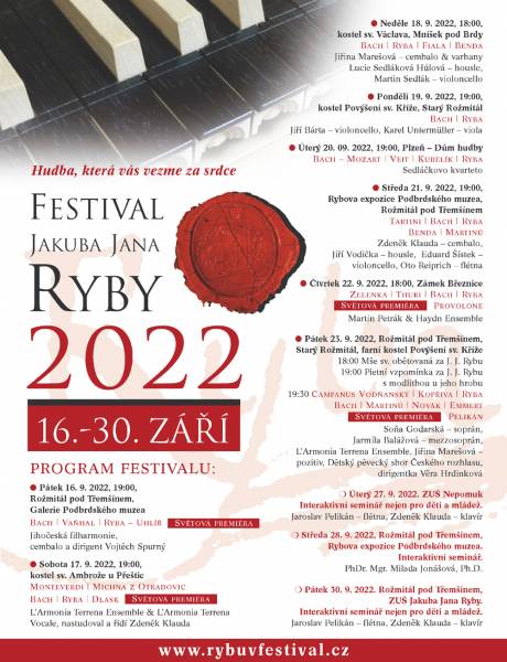 Během dvou týdnů bude na pořadu celkem osm koncertů, mše s pietní vzpomínkou na Jakuba Jan Rybu a edukativní projekty – to vše na rybovských místech v Rožmitále pod Třemšínem, v Přešticích, v Mníšku pod Brdy, v Plzni, na zámku v Březnici a v Nepomuku.