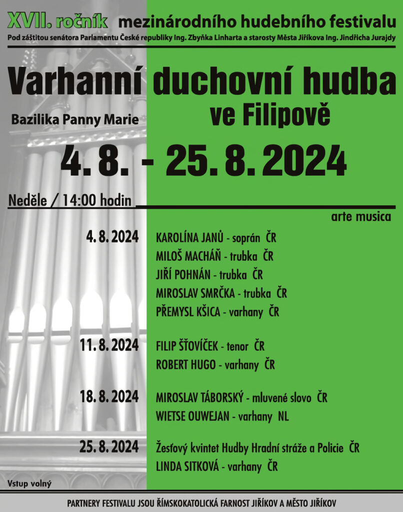 První srpnovou neděli začíná sedmnáctý ročník hudebního festivalu Varhanní duchovní hudba, jehož dějištěm je poutní bazilika Panny Marie ve Filipově ve Šluknovském výběžku. Ve známém katolickém chrámu stojícím jen několik metrů od německé hranice jsou vzácné romantické varhany, postavené budyšínskou firmou Eule v roce 1888 a zrekonstruované v roce 2009. Koncerty se konají od 4. do 25. srpna každou neděli, začínají ve čtrnáct hodin a vstup je volný.