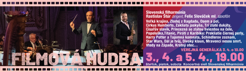 Jedním z nejvýznamnějších fenoménů hudební produkce 20. století je filmová hudba. Technologická revoluce v oblasti hudebně-dramatických žánrů, prudký rozvoj v oblasti kinematografie, velmi silné společenské zázemí, které si film v průběhu desetiletí vybudoval, efektní a efektivní souhra umění a techniky způsobily dramatický pokrok v této specifické oblasti umělecké činnosti. Od dob, kdy černobílý film doprovázeli zkušení klavíristé přímo v „biografech“, se situace velmi rychle vyvinula směrem k unikátním zvukovým stopám. A ty jsou zase v poslední době často prezentovány i bez ostatních složek filmu, kterému jsou původně určeny. Tak si počíná i Slovenská filharmonie na nejbližších koncertech ve své Koncertní síni. K poslechu nabídne melodie z filmů Titanic, Piráti z Karibiku, Star Wars, Harry Potter, Cirkus Humberto, Zakletá jeskyně a Tři zlaté dukáty. Hlavními interprety budou dirigent Rastislav Štúr a saxofonista (a rovněž dirigent) Felix Slováček mladší.