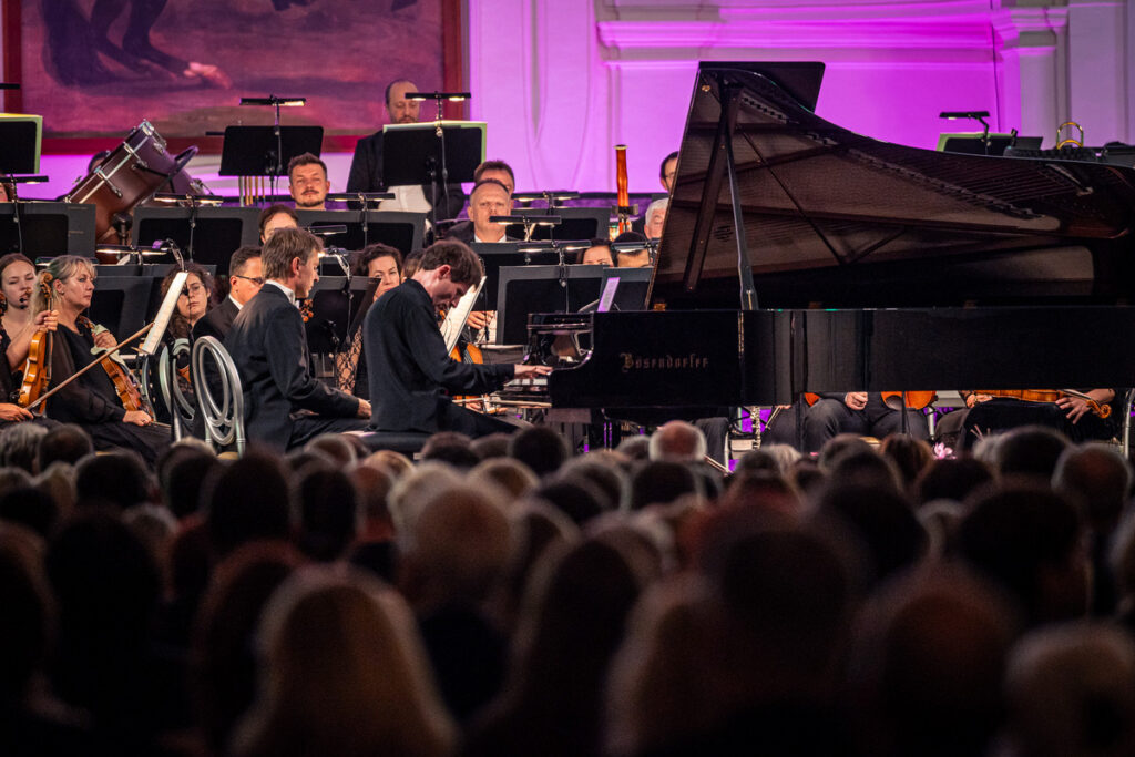 Předehra k satirickému Candidovi, která večer nesmlouvavě otevřela, je mimořádně prostořeká. Leonard Bernstein ji naplnil břitkostí, neodolatelnými melodiemi, náhlými akcenty a šťavnatými metro-rytmickými proměnami. Následovala Rapsodie v modrém, ikonické dílo George Gershwina s proslulým klouzavým, vzhůru směřujícím klarinetovým sólem v úvodu. Sólista Boris Giltburg, skvěle technicky i muzikálně vybavený, ji společně s dirigentem připomněli jako vesměs hodně rychlé, kaleidoskopicky proměnlivé dílo, jako jakési jazzové concertino, plné charakteristických idiomů a bravurních prvků. Pianista sice sklouzával občas až k příliš neklidnému, nervnímu projevu, ale výsledný dojem byl zaručený: efektní, dobře známý kus zapůsobil jako zcela pochopitelný spouštěč emotivních posluchačských reakcí.