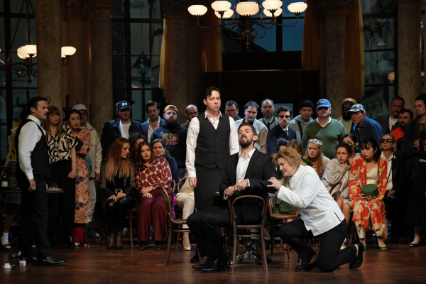 Režie Stefana Herheima, současného intendanta Theater an der Wien, překvapila funkčností a úměrností, vycházející z emočního hnutí postav, koncepční prací se sborem, který se ústrojně zapojuje do dění, má neustálý pohyb, byť jen jako pantomimu, včetně účinných střihů s využitím stronza. I když hudebně jsou zachovány árie da capo a jednání postav je střídmé, děj neztrácí na napětí a mysl diváka je stále více vtahována do příběhu, který vrcholí hudebním veletokem. Jediným centrálním prvkem, využitým k akcím, je kulečníkový stůl. Všechny akce do sebe zapadaly a dohromady fungovaly přirozeně a přesvědčivě. Jen snad ten anděl s křídly a v obleku, stojící na úplný závěr představení na střeše nad vším, s hořícím ohněm v rukou, byl poněkud mimo styl představení.