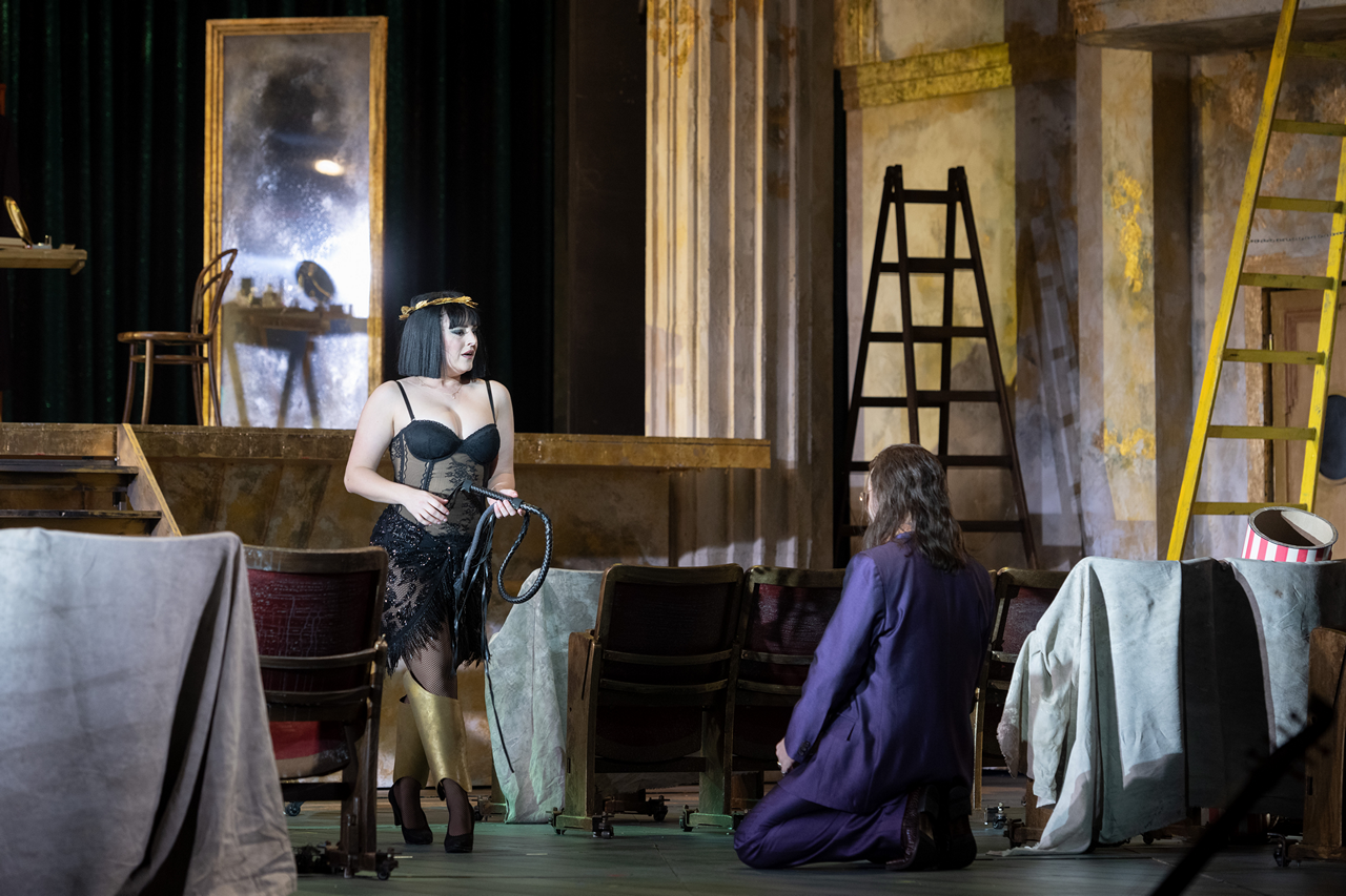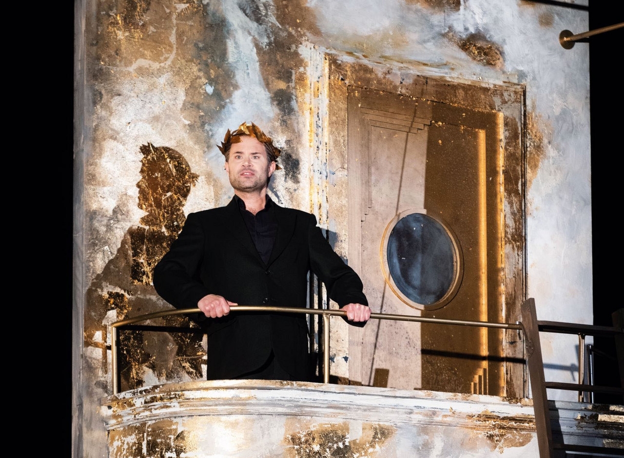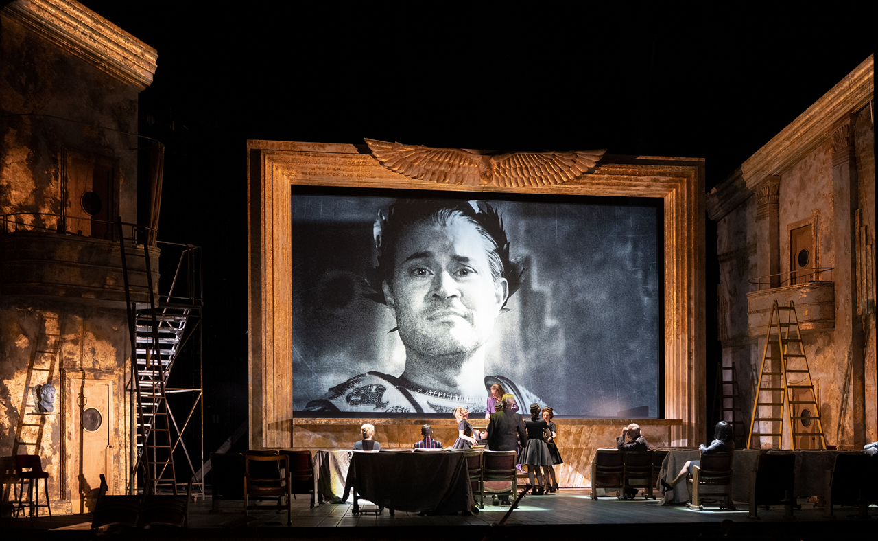 Tady využil formát „divadlo na divadle“, ve kterém se prolíná historický děj do současných kulis a vztahů. Divadelní sál, ve kterém se promítá film o barokní opeře v rytířských historických kostýmech a kde se pár diváků v sále velmi nudí, se náhle proměňuje. Vzniká místo, ve kterém začne děj o Caesarovi ožívat a nudící se diváci se stávají sami protagonisty, kteří hrají historický děj v současných kostýmech a kulisách. Pojďme si představit, jak by tento příběh ve stejném operním provedení fungoval dnes. Postupně mizí i divadlo a boje o moc ve druhé části opery probíhají v jakémsi oploceném cirku a jsou velmi fyzicky krkolomné. Přestože jde o operu seria a o vážné historické téma, neváhal režisér děj prošpikovat vkusnými a vtipnými gagy, které baví jak herce, tak publikum. Občas není jasné, jestli jde o parodii na operu seria, ale pěvecké výkony v žádném případě parodií nejsou, ty jsou opravdové.