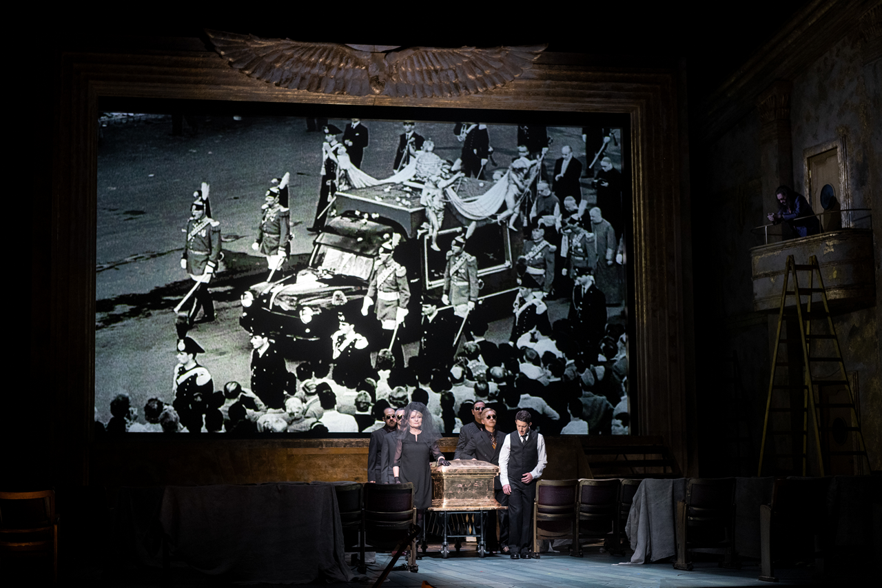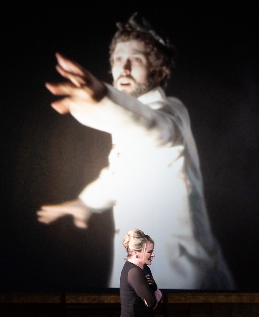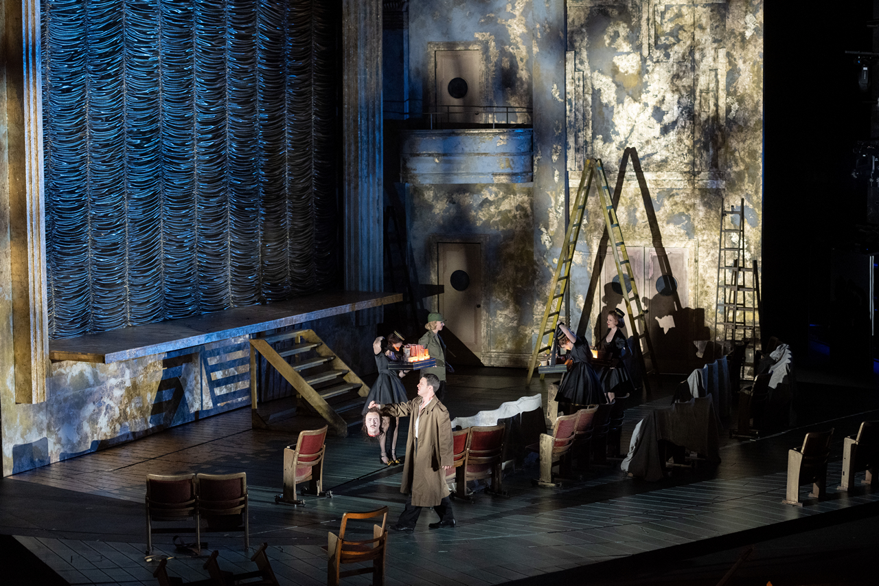 Tady využil formát „divadlo na divadle“, ve kterém se prolíná historický děj do současných kulis a vztahů. Divadelní sál, ve kterém se promítá film o barokní opeře v rytířských historických kostýmech a kde se pár diváků v sále velmi nudí, se náhle proměňuje. Vzniká místo, ve kterém začne děj o Caesarovi ožívat a nudící se diváci se stávají sami protagonisty, kteří hrají historický děj v současných kostýmech a kulisách. Pojďme si představit, jak by tento příběh ve stejném operním provedení fungoval dnes. Postupně mizí i divadlo a boje o moc ve druhé části opery probíhají v jakémsi oploceném cirku a jsou velmi fyzicky krkolomné. Přestože jde o operu seria a o vážné historické téma, neváhal režisér děj prošpikovat vkusnými a vtipnými gagy, které baví jak herce, tak publikum. Občas není jasné, jestli jde o parodii na operu seria, ale pěvecké výkony v žádném případě parodií nejsou, ty jsou opravdové.