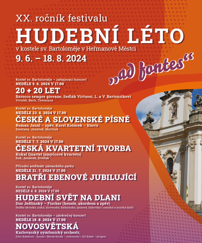 Dvacátý ročník festivalu Hudební léto v kostele sv. Bartoloměje v Heřmanově Městci (okres Chrudim v Pardubickém kraji) také přispívá k oslavě Roku české hudby 2024. Již zahájený festivalový cyklus, který se o slovo hlasí zhruba jednou za dva týdny, završí v druhé polovině srpna Karlovarský symfonický orchestr a sólisté spjatí s pořadatelským městem.