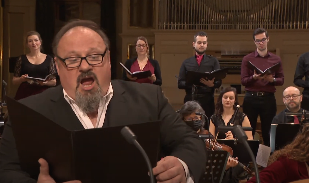 Původně, podle plánů počítajících s normální a ne koronavirovou situací, se měl koncert konat v kostele svatých Janů. Přesunutí do Besedního domu by samozřejmě živému publiku akusticky a atmosférou vadilo. Pro internetový přenos, jak během večera sledujeme, je však vhodné. Zvuková režie může podchytit víc detailů. A vizuální podoba má charakteristický rys: přiznané zázemí. Nerezignuje sice na obvyklé polocelky i detaily zpěváků, instrumentalistů a dirigenta, ale klidně – odlišně od klasických televizních přenosů – dává nahlédnout z lehkého odstupu i do celku sálu: na kameramany v pohybu i na spleť kabelů. Vůbec to nevadí. Stream nemusí být konvenčním přenosem. Stejně jako nemůže být a není zprostředkovatelem úplně stejného pocitu a dojmu, jako když jsme v sále…