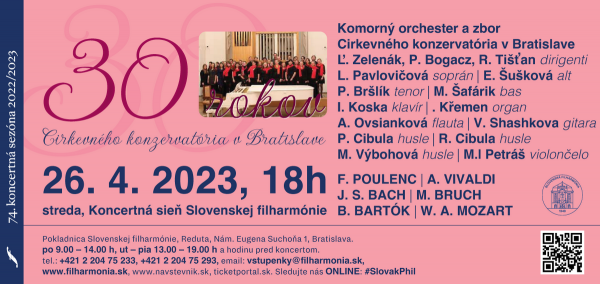 Dnes, ve středu 26. dubna pořadatelé v Koncertní síni Slovenské filharmonie přivítají studenty, pedagogy a absolventy Církevní konzervatoře v Bratislavě. Tímto koncertem od osmnácti hodin vyvrcholí umělecké aktivity u příležitosti třicátého výročí fungování instituce. Na pódiu se představí komorní orchestr školy, současní studenti a absolventi konzervatoře, ale i hosté pod vedením pedagogů a dirigentů Róberta Tišťana, Pavla Bogacza a Ľubomíra Zelenáka.