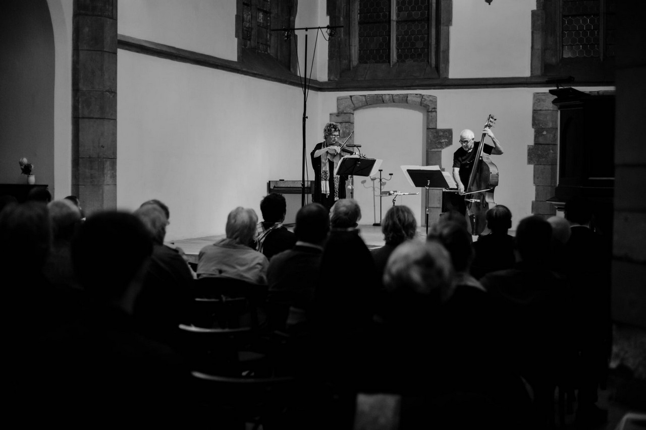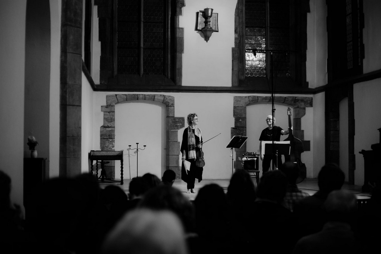 Maya Homburger započala budovat kariéru v oblasti interpretace staré hudby a stala se uznávanou hráčkou na barokní housle. Barry Guy je známý především pro svůj experimentální přístup k hudbě, a to zejména v oblasti jazzové improvizace a kompozice soudobé hudby pro rozmanitá hudební uskupení. Je zřejmé, že výsledek takového spojení bude přinejmenším nepředvídatelný. Skutečně – hudba, kterou umělci v průběhu přibližně hodinového programu zahráli, pravděpodobně nemá obdoby. Své vystoupení započali blokem čtyř skladeb – nejprve zazněl gregoriánský hymnus Veni Creator Spiritus, následovala Růžencová sonáta č. 1 Heinricha Ignaze Bibera, poté Hommage à J. S. B. Gyögye Kurtága a na závěr Guyovo Five for Anja.