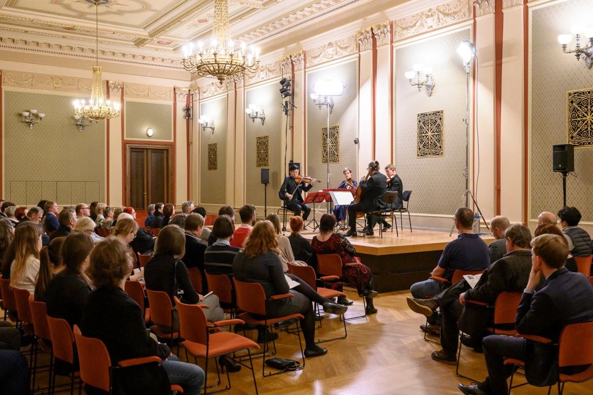 Miroslav Srnka je jedným z najvýraznejších českých skladateľov súčasnosti. Jeho diela uviedla Bavorská štátna opera v Mníchove, Semperova opera v Drážďanoch, z inštrumentálnych zoskupení to bol napríklad legendárny Ensemble Intercontemporain. S francúzskym Quatuor Diotima v zložení Yun-Peng Zhao (husle), Constance Ronzatti (husle), Franck Chevalier (viola) a Pierre Morlet (violončelo) pritom už skladateľ podľa vlastných slov spolupracuje viac než osem rokov a Future Family nie je prvým kvartetom, ktorý interpretovali. Včerajší koncert bol spojením českej premiéry a relatívne rozsiahleho autorovho predstavenia diela, ktoré však bolo v kontexte pochopenia skladby určite prospešné a pútavé.