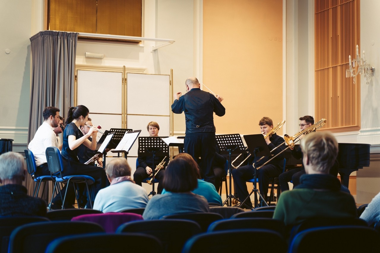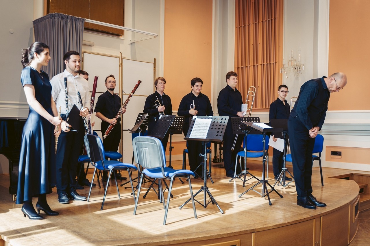 Ve druhé části koncertu nastoupili studenti Theodora Kopecká na flétnu, Marek Pavlíček na klarinet, Aliaksei Charnavoki a Jan Jelínek na fagoty, Petr Čižinský a Jan Fistr na trubky, Radek Novák a Jaroslav Petráš na trombony. Tak početné těleso už vyžaduje dirigenta, kterým byl pedagog Vít Spilka.
