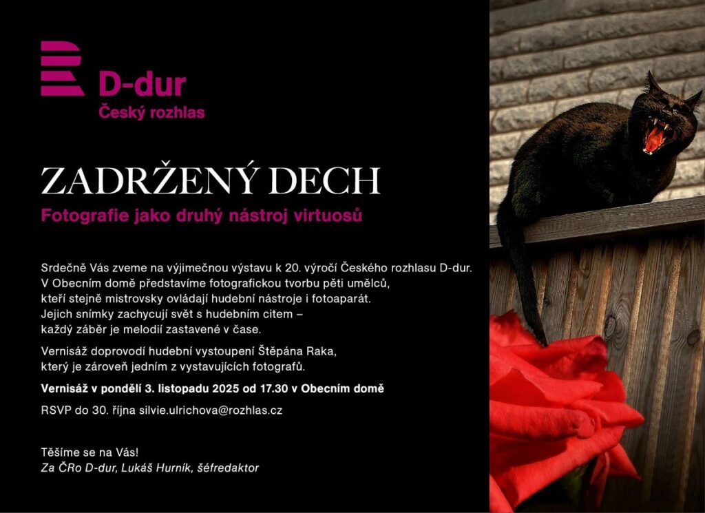 Stanice Českého rozhlasu D-dur, známá svým nepřetržitým vysíláním klasické hudby, slaví letos dvacet let své existence. Jubileum připomene výstava s názvem Zadržený dech: Fotografie jako druhý nástroj virtuosů, která propojuje hudbu s vizuálním uměním a nabízí pohled na svět očima umělců, pro něž je primárním uměleckým jazykem hudba. Kurátorem projektu je Lukáš Hurník, šéfredaktor stanice, který přizval k účasti kolegy z hudebního světa: violoncellistku Michaelu Fukačovou, kytaristu Štěpána Raka, hobojistu Viléma Veverku a hudebního dramaturga Vojtěcha Havlíka. Každý z nich představí svůj osobitý vizuální jazyk a v jeho či jejích fotografiích se odráží rytmus, dynamika i klid hudebního myšlení. „Každý snímek nese hudební rytmus – je to melodie, která se na chvíli zastavila v čase,“ uvedl Hurník. Výstava je podle něj nejen oslavou výročí stanice, ale i připomínkou, že umění nezná hranic mezi žánry a médii.