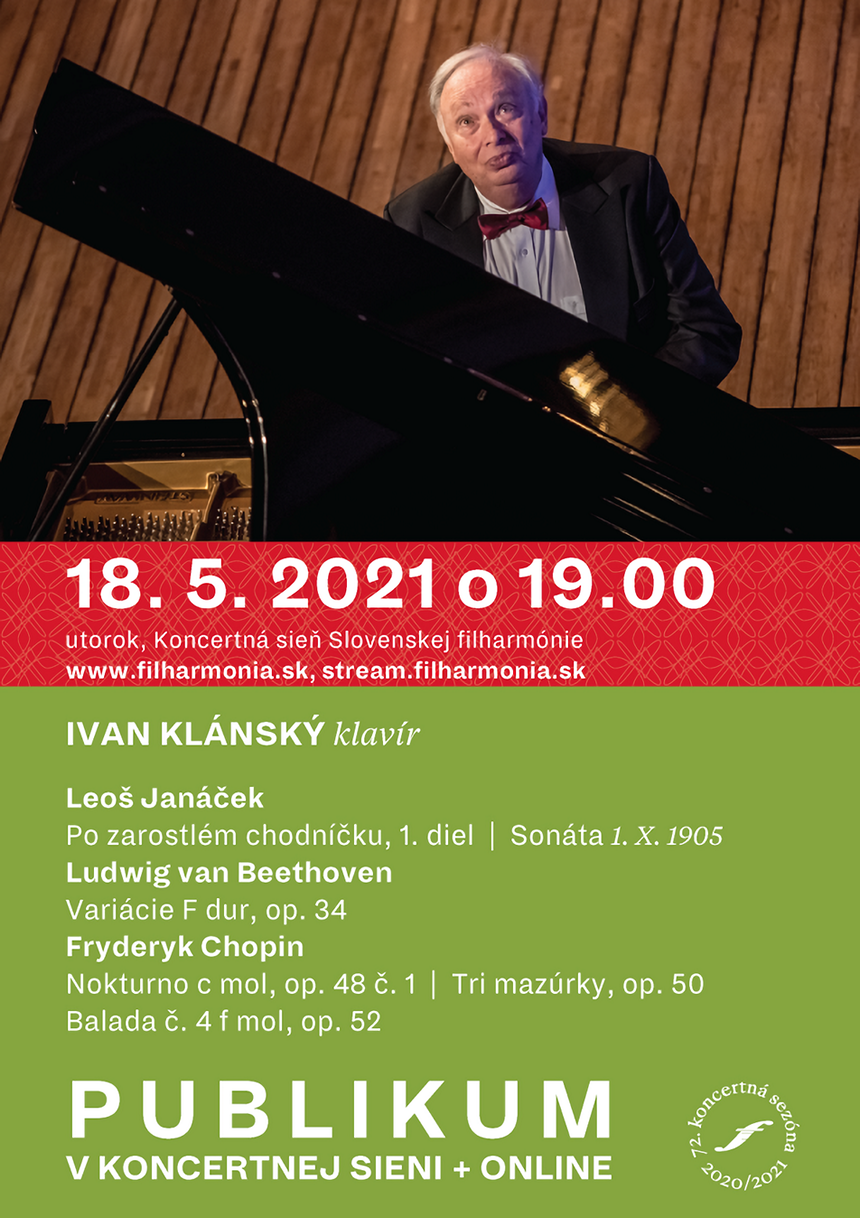 Dnes se v Koncertní síni Slovenské filharmonie uskuteční klavírní recitál Ivana Klánského, a to za účasti publika, ale i v přímém přenosu online. Od 19 hodin bude k vidění na stream.filharmonia.sk. Náš přední klavírista zahraje první řadu cyklu Po zarostlém chodníčku Leoše Janáčka a také jeho Sonátu 1. X. 1905 Z ulice. Poté zazní Variace F dur, op. 34 Ludwiga van Beethovena a tři skladby Fryderyka Chopina – Nokturno c moll, op. 48, č. 1, Tři mazurky, op. 50 a Balada č. 4 f moll, op. 52.
