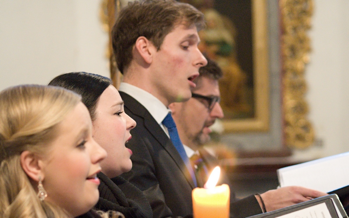 L´Armoria terrena Ensemble hraje prakticky v takovém složení, v jakém hrával orchestr na starorožmitálském kůru – 1. a 2. housle, viola, violoncello, kontrabas, 1. a 2. klarinet a 1. a 2. lesní roh, doplněný občas o flétnu a hoboj. Mimochodem v tomto složení zaznívala v kostele Povýšení sv. Kříže i Česká mše vánoční, na provedení stočlenným symfonickým orchestrem, osmdesátičlenným sborem a operně školenými sólisty by Ryba asi nevěřícně zíral. Podle programu večera mělo zaznít jako první Offertorium pro III. neděli postní. Dramaturgie však zařadila jako první Offertorium pro VI. neděli postní. Z hlediska gradace to bylo dobré rozhodnutí. Offertorium pro VI. neděli je tragické, vyjadřuje zoufalost a výčitky. Sóla se ujal Jakub Koś, studující zpěv na AMU u prof. Ivana Kusnjera. Jeho tenor je zatím nevyzrálý, výšky však už zvládá dobře, chybí mu kulatost tónů. Následovaly tři árie ze souboru Octo ariae et duetto. První byla árie O Deus ego amo te, kde se uplatnil soprán mladé Terezy Maličkayové. Výtečný hlasový fond, dobrá práce s dechem, krásné výšky i koloratura, to vše u tak mladé pěvkyně až překvapuje. Pasáž dialogu jejího hlasu s prvními houslemi patřila k těm nejkrásnějším z celého koncertu. Árii Et factus est přednesl Jaroslav Patočka, zkušený pěvec, vynikající krásným měkkým basem, který byl na bas až překvapivě znělý. Kromě sólisty mají v této skladbě významnou roli i klarinet, lesní roh a viola, které jsou lidskému hlasu rovnocennými partnery. Árie s názvem, který jsme už slyšeli, O Deus ego amo te, je jiný opus na jiná slova a napsaný jako duetto pro soprán a alt. Vedle Terezy Maličkayové vystoupila mezzosopranistka Jarmila Balážová, rovněž mladá pěvkyně s výtečnou hlasovou technikou. Obě mladé umělkyně přednesly společně i árii Offerro tibi cor meum. Rybovu část koncertu zakončilo Offertorium pro III. neděli postní, radostná skladba plná jiskřivé hudby, v níž kvartet pěvců i orchestr předvedli skvělý výkon.