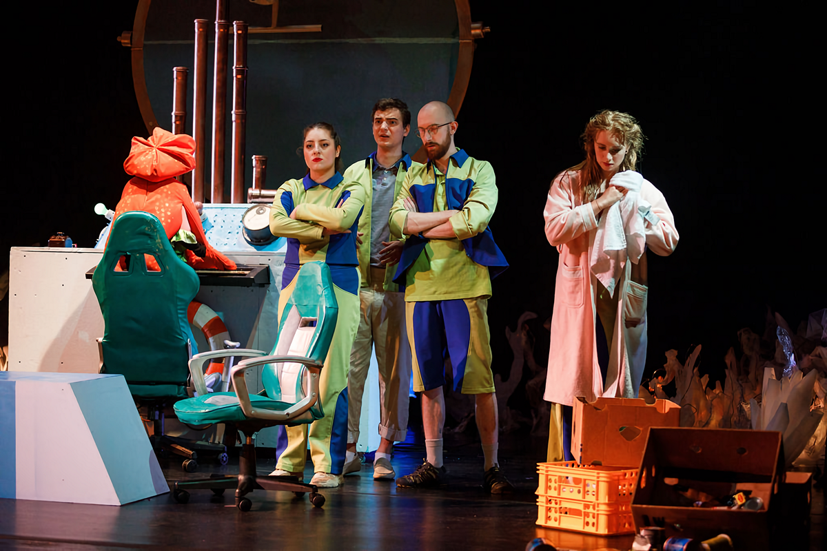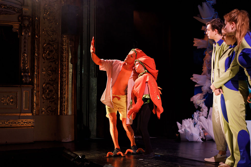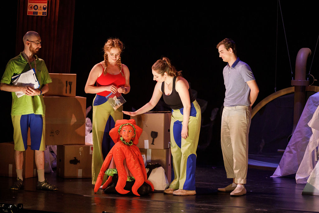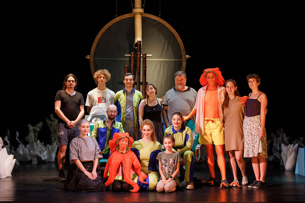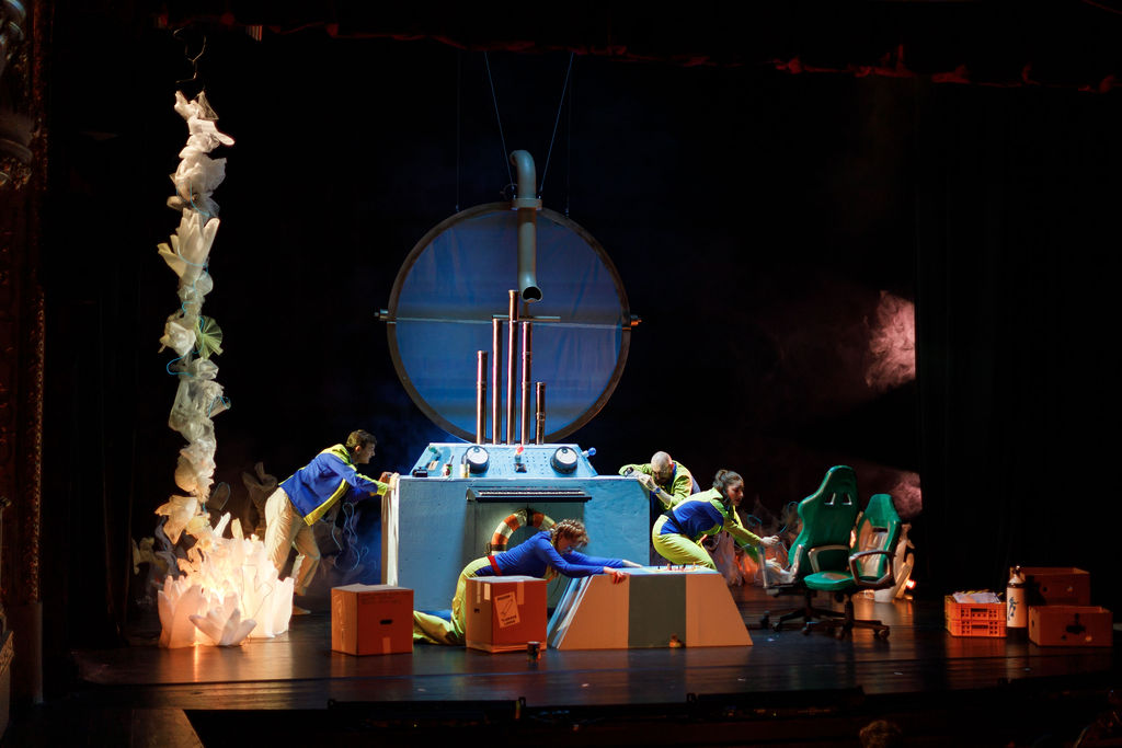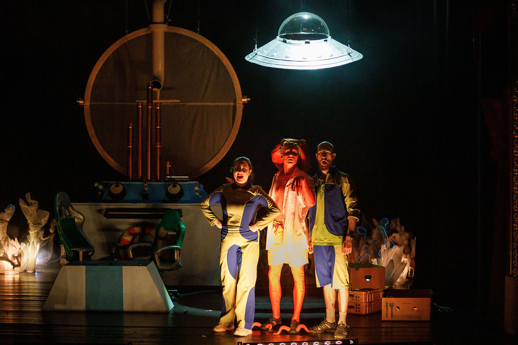 Daná autorská poetika, pohrávající si s naivismem, odpovídá zvolenému způsobu realizace – veskrze studentskému představení. Těžko si lze představit skutečné profesionály, jak se snaží stylizovat do mantinelů, které tu jsou žánrově jasně stanovené. Jednoduché prostředky, dané charakterem partitury a na maličké scéně dobře zvolenou scénografií a správně odhadnutou režií, korespondují s dosud ne zcela rozvinutými hlasovými a hereckými schopnostmi mladičkých studentů. Denis Zjatik jako rozvážný kapitán Nemo, Simeon Hána v roli rozevlátého inženýra Smithe, Bedřiška Ponížilová jako plavčice Salma a Anna Zedníčková coby harpunářka Neda se pokusili s obdobnou mírou základní úspěšnosti vyrovnat se s ne úplně lehkými party a s množstvím textu a vytvořit psychologicky a typově jedinečné postavy. Přidal se k nim na nevelké ploše František Sliž jako mimozemšťan Alcor. Roztomilá je nezpívaná dětská role chobotničky Mantíka.