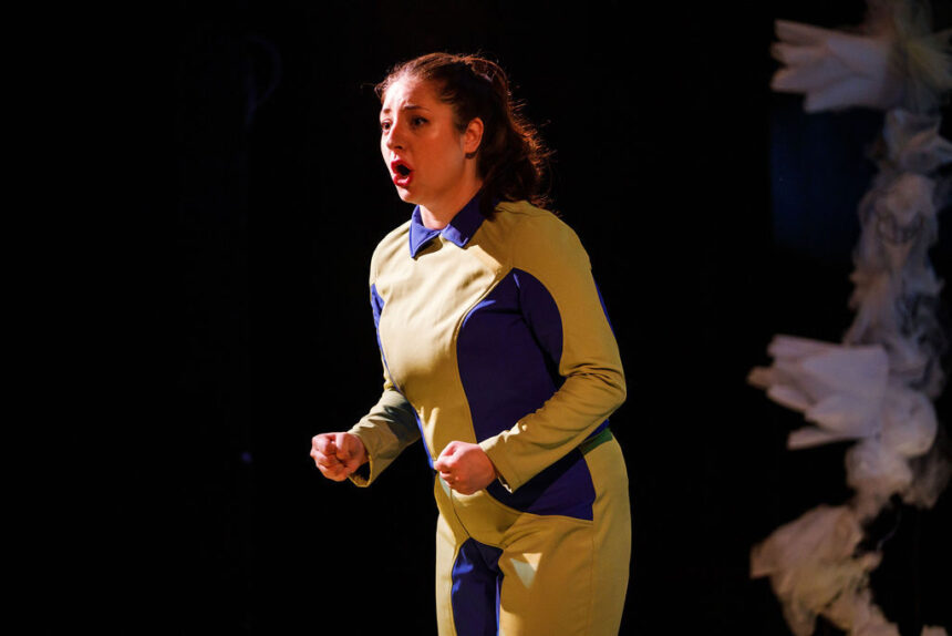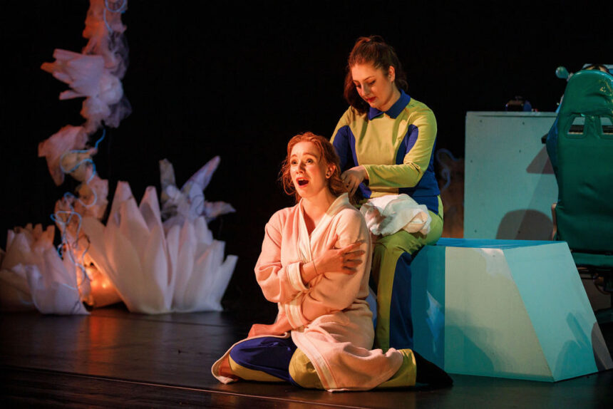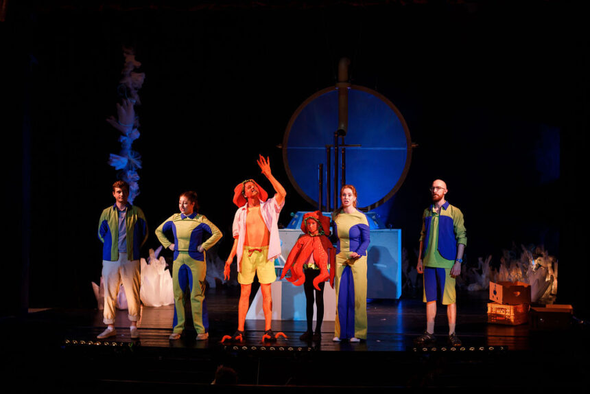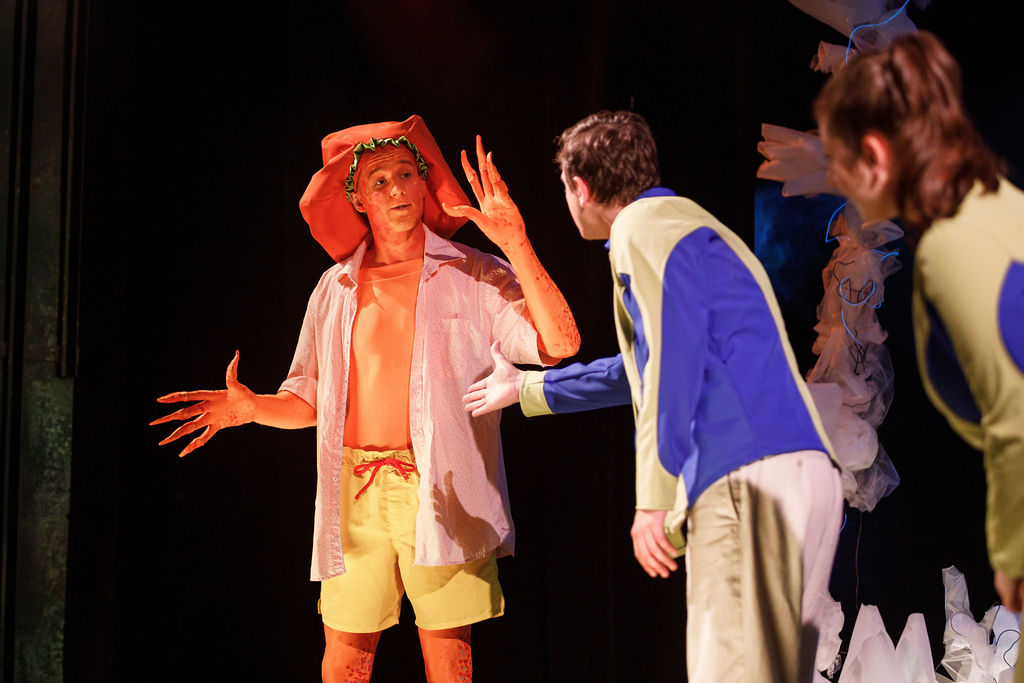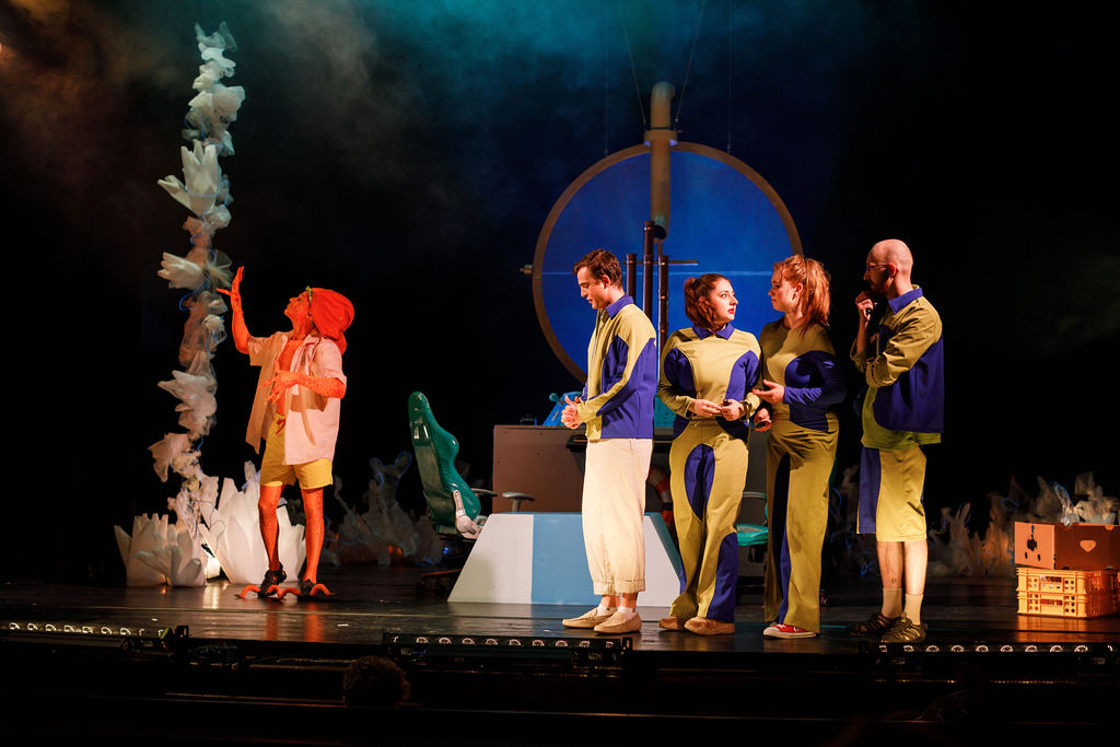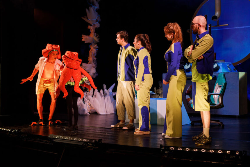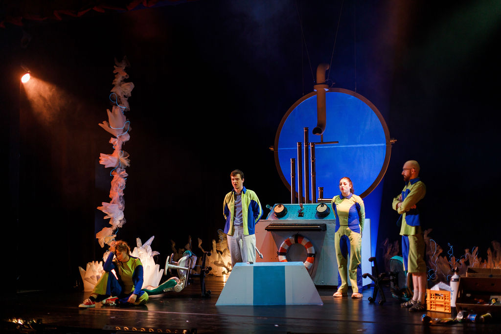 Daná autorská poetika, pohrávající si s naivismem, odpovídá zvolenému způsobu realizace – veskrze studentskému představení. Těžko si lze představit skutečné profesionály, jak se snaží stylizovat do mantinelů, které tu jsou žánrově jasně stanovené. Jednoduché prostředky, dané charakterem partitury a na maličké scéně dobře zvolenou scénografií a správně odhadnutou režií, korespondují s dosud ne zcela rozvinutými hlasovými a hereckými schopnostmi mladičkých studentů. Denis Zjatik jako rozvážný kapitán Nemo, Simeon Hána v roli rozevlátého inženýra Smithe, Bedřiška Ponížilová jako plavčice Salma a Anna Zedníčková coby harpunářka Neda se pokusili s obdobnou mírou základní úspěšnosti vyrovnat se s ne úplně lehkými party a s množstvím textu a vytvořit psychologicky a typově jedinečné postavy. Přidal se k nim na nevelké ploše František Sliž jako mimozemšťan Alcor. Roztomilá je nezpívaná dětská role chobotničky Mantíka.