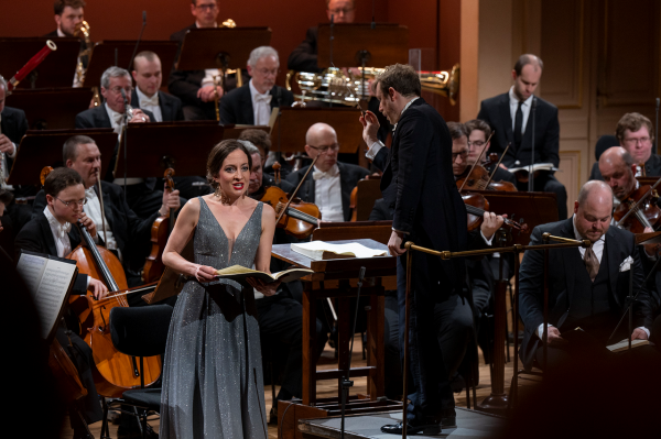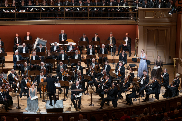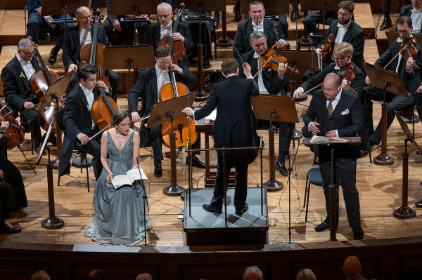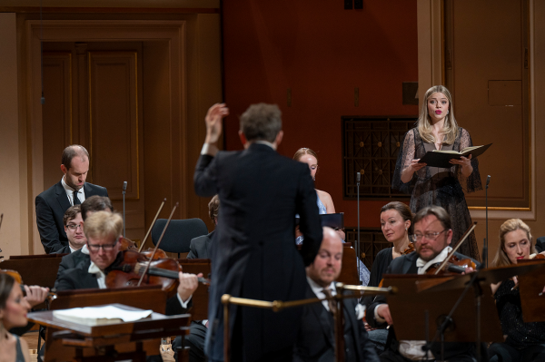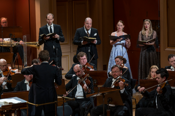 Daniel Harding pojal toto epické dílo velkoryse po všech stránkách – výrazu, tempech, dynamice i obsazení. Hned po příchodu orchestru upoutalo pozornost odlišné rozsazení smyčců s kontrabasy vedle primů a violoncelly a violami uprostřed, zatímco sekund byl umístěn vpravo. Netuším, jestli se jednalo o stylovou interpretaci, nevšednost pojetí nebo prostorovou nutnost. Neboť sólisté nebyli všichni před orchestrem, jak by se dalo očekávat, ale část z nich stála vpravo za violami. Kdyby v těchto místech byly kontrabasy nebo violoncella, patrně by sólisté nemuseli být ani slyšet a možná ani vidět. Těžko říct… A i když mohlo toto uzpůsobení působit nezvykle, výsledku to nijak neuškodilo, možná i pomohlo na plasticitě zvuku smyčců. Před orchestrem své místo našli pouze dva sólisté – charismatická sopranistka Christiane Karg a neméně přesvědčivý tenorista Andrew Staples (ten byl také sólistou na výjimečné nahrávce Sira Simona Rattlea). Tenorista v průběhu opakovaně odcházel ke zbývajícím třem sólistům a vracel se zpět. Musím říct, že tento „scénický“ prvek působil lehce rušivě. Jeho opodstatnění jsem nalezl snad jen v pomyslných dialozích či komentářích k Peri, které byly díky tenoristově postavení vpředu přeci jen věrohodnější. Rozumím, že kvartetní ansámbly by zněly nekompaktně, kdyby jeden sólista byl vpředu a další tři na pomyslném „detašovaném pracovišti“ za violami. Jeho přecházení bylo tedy do jisté míry kompromisním řešením, i když možná ne nejelegantnějším. Druhou, i když pochopitelně dražší možností, by patrně bylo angažovat tenoristy dva (Ostatně na zmíněné Rattlově nahrávce je sólistů sedm). Třetí pak nechat stát všechny sólisty vpředu.