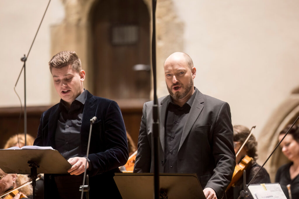 Kučerových Šest vánočních písní pro sóla, sbor, varhany a orchestr s titulem Benedicamus Domino diváci vyslechli s přispěním elitního českého tenoristy Daniela Matouška, dále barytonisty, také sólisty pražské Opery Národního divadla Jiřího Hájka a ještě nejmenované (bohužel), velmi pěkně snaživé sólistky z Dětského pěveckého sboru Českého rozhlasu. Pěvce Matouška považuju za TOP 5 českých tenoristů, kvalitu prokázal mnohokrát, vytížený je právem jako málokdo a technicky je spolehlivý. V daném případě však nepřesvědčil, byť všecko odzpíval bezpečně. Nejnápadnější úlohu obdržel v písni Kristus Pán se narodil, kterou se Jan Kučera rozhodl posadit, nutno říct, do nepříjemně vysoké polohy, navíc s velmi subtilním doprovodem, tudíž pro vokál o to nekomfortněji. Předchozí spoluprací s písňovým spolkem Lieder Society bych očekával podstatnější projevení se tohoto faktu v přístupu zpěváka k prostým vánočním písním, jež vyžadují zejména civilní, co nejpřirozenější, nějak obyčejný, jednoduchý, klidně až banální interpretaci. 12. prosince však byl slyšitelný zejména operní background pěvce, který zároveň neeliminoval nevhodné „vozíčky“, tu intonační berličku nejednoho umělce. Jiří Hájek zmíněné problémy nevykazoval, jeho vklad daleko lépe odpovídal koloritu věci, interpretoval citlivěji, ovšem v mnohem snazším partu.