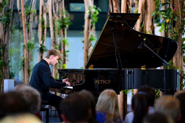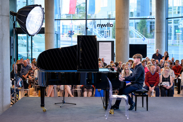 Schulmeisterův klavírní recitál pro mě mimo jiné znamenal první návštěvu v Bořislavka Centru. Nemám nic proti neformálnímu pojetí koncertů a je klidně možné, že festival Dvořákova Praha má pro využití tohoto prostoru i jiné důvody než jenom ty prozaické (možná by bez něj nebylo možné prezentovat mladé umělce?). Jako posluchači mi tam ale bylo krajně nepříjemně. Nejde ani tolik o jednotlivé důvody, jako spíš o kombinaci několika z nich najednou. Improvizovaný sál se nachází v proskleném parteru budovy, a proto má divák neustále na očích dopravní situaci venku na ulici. Před koncertem z reproduktorů hraje na pozadí jakási pohodová hudba, vlastně hudební smog, kterému usazení posluchači ani nevěnují pozornost, a který je přesto v nějakém vztahu k živé hudbě, jež bude následovat jako hlavní bod události. Jakási instalace na stropě neustále mění intenzitu osvětlení, a to bez jakéhokoliv uměleckého důvodu. Zaměstnanci budovy během vystoupení chodí po prostoru, klapají za nimi těžké dveře a vstupují do čehosi, co – soudě podle zvukové signalizace – nejspíš budou výtahy.