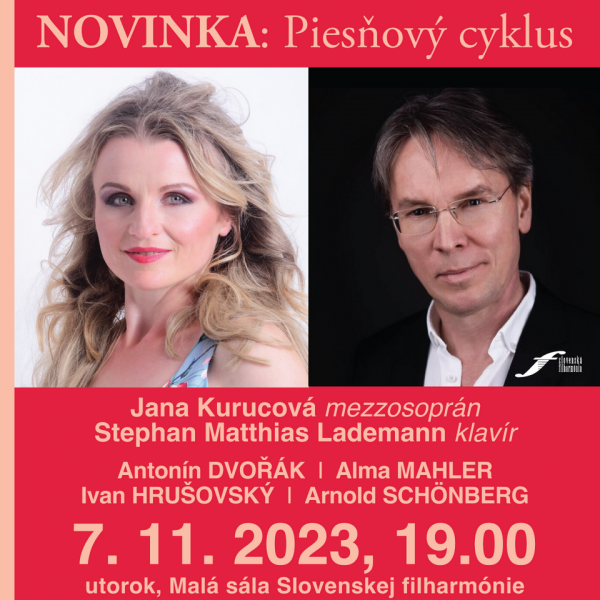 Novinkou 75. koncertní sezóny prvního orchestru východních sousedů je cyklus Písňové večery v Malém sále Slovenské filharmonie. Úvodní koncert je na programu v úterý 7. listopadu. Patřit bude slovenské mezzosopranistce s mezinárodním renomé Janě Kurucové, která svůj program poskládala z výjimečně uváděných vokálních děl Antonína Dvořáka, Arnolda Schönberga, Almy Mahler a Ivana Hrušovského. Sólistka hamburské opery a hostka předních operních a koncertních scén se v bratislavské Redutě představí s klavírním doprovodem Stephana Matthiase Lademanna.