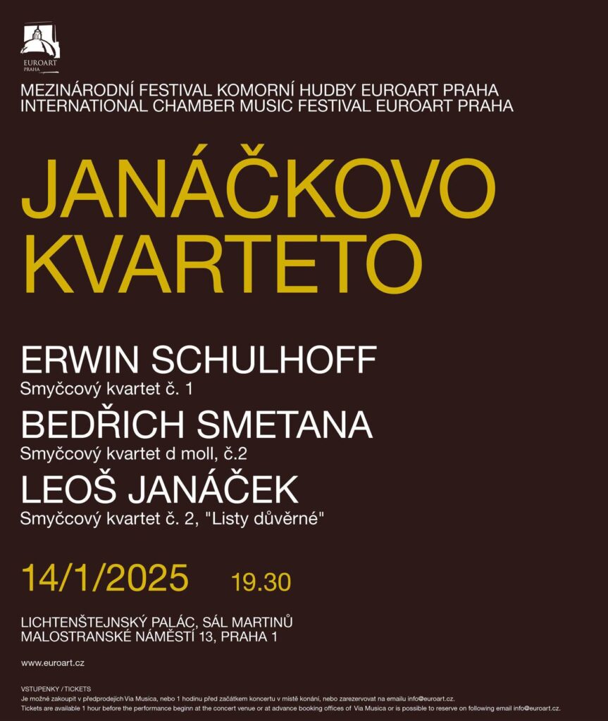 Pátý koncert letošního sezony cyklu EuroArt Praha se uskuteční jako tradičně v Lichtenštejnského paláci v Sále Martinů, a to večer 14. ledna. Tentokrát nevystoupí rezidenční a hostitelské Stamicovo kvarteto, ale kvarteto Janáčkovo v dílech Schulhoffa, Smetany a Janáčka.