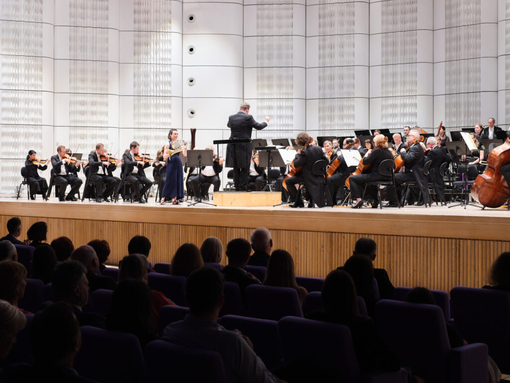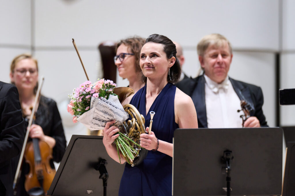 Ve druhé větě Andante podávala sólistka pomalou melodii s měkkým a pevným napětím, pohladilo dueto s klarinetem Mateje Veselky, tajuplnou atmosféru podpořila violoncella. Třetí větu Allegro zvládala sólistka s brilantními běhy spolu se svižným doprovodem orchestru. Melodickou linku horny podpořila flétna Vladimíra Vodičky, dramatická část vyplněná dalším efektním sólem se zklidnila, aby připravila rozjezd brilantní kadenci lesního rohu, které se sólistka zhostila se sebevědomou a klidnou bravurou. Obecenstvo ji za to odměnilo obdivem a nadšeným potleskem.