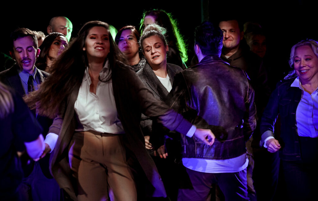 Spolu se sborem zaplňují prostor na jevišti kolem bytu, orámovaného obrazovkou s neonovým osvětlením. Místa mají málo, přesto zde křepčí v rytmizovaném tanci, který se po chvíli stává nudným, neboť je nekoordinovaný a se stále stejnými pohyby, ale alespoň hlasy znějí kompaktně. Spolu s nimi „trsá“ i Kostelnička v podání Elišky Gattringerové. Ta je excelentní, je dominantní postavou inscenace, kterou podává s dobře vypočítaným psychologickým vývojem a s volným, pevným dramatickým sopránem. Jenůfou je Barbora Perná, její soprán je dobře nosný, ale nucený silou orchestru k forzi, což jí postupně znemožňuje cizelovat jímavá piana. Přesto je její modlitba křehká a něžná, i když rušená nelogickým režijním zásahem.