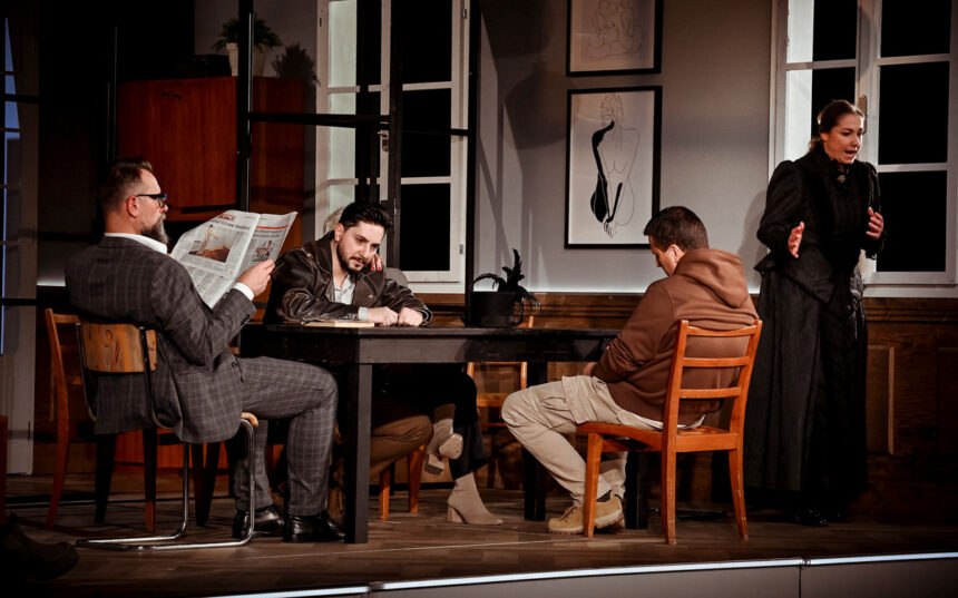 Dramaturgická práce Marty Ljubkové spolu s režií Veroniky Kos Loulové posunuje příběh Jenůfy do současné doby, stejně jako scéna a kostýmy Iriny Moscu. Byt v paneláku, orámovaný kukátkovým jevištěm, obývají členové rodiny, jejichž interakce je mizivá a akce mimo zpívaný děj. Stařenka, v podání Sylvy Čmugrové, je dobře udržovaná padesátnice, na místo krájení brambor (či jablek, řepy apod…) si luští křížovku, zatímco Jenůfu volá k práci. U stolu sedí Laca, urostlý energický mladý muž s průrazným tenorem Josefa Moravce a stále si nervózně hraje s noži. Stárkem je Jiří Přibyl, jediný vyrovnaný člověk v místnosti, s mužným a nosným barytonem. Barena, v podání Anny Moriové, se jako jediná zabývá nějakou domácí prací. Števa Buryja, kterého představuje Raman Hasymau, je nervově labilní mladík, tenor je sice znělý, ale zbytečně pod forzí.