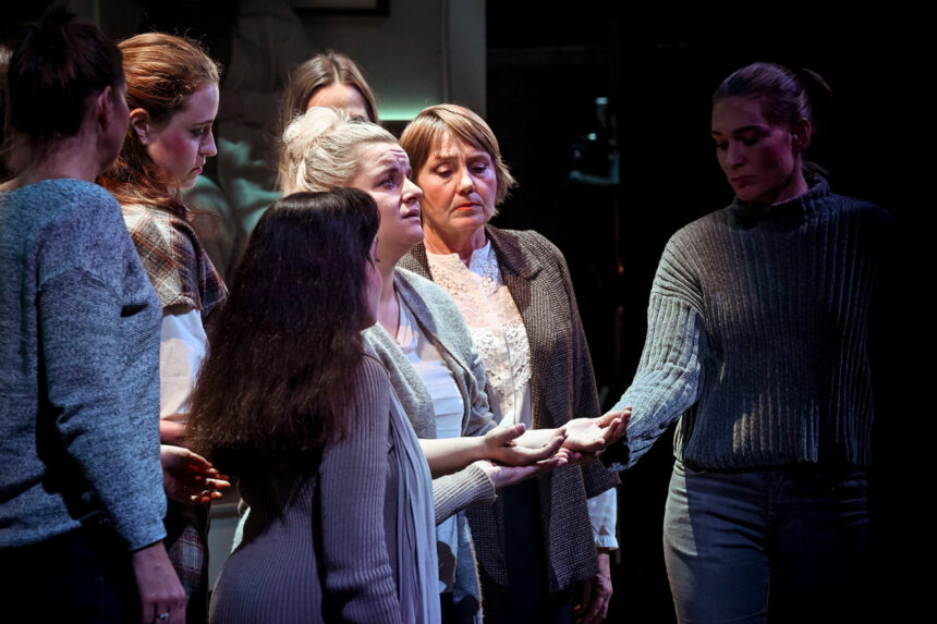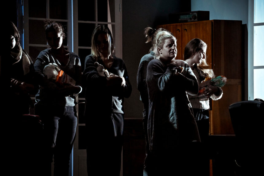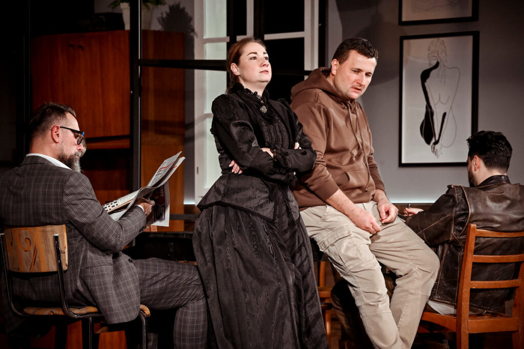 Dalo se pochopit, že kukátkové jeviště rámuje a kodifikuje nějaké tradice a zvyky. Ale jaké? Tehdejší? Současné? A jaké to jsou? Dnešní svobodné matky mají oproti době Gabriely Preissové snové podmínky, i když některá s tím nemusí souhlasit. Finanční podpora v mateřství, právní nárok na příspěvek otce dítěte a hlavně bez ostrakizace společnosti, svobodná matka i dítě je jejím plnoprávným členem. Samozřejmě, že to nemá lehké, potýká se s řadou problémů – ale ty inscenace nijak neřeší, dokonce ani nezmiňuje! Ze současného života na nás vykoukne, namísto nádherného katarzního duetu Laca–Jenůfa, kapela Viah, která za doprovodu elektrických kláves rozjede diskotéku, na které opět křepčí všichni účastníci inscenace, Kostelničku nevyjímaje. Takže všechny problémy jsou nakonec vyřešeny a tancuje žena s ženou. „Zůstává mi rozum stát…,“ zpívají členky kapely. Přiznávám se, že mně taky.