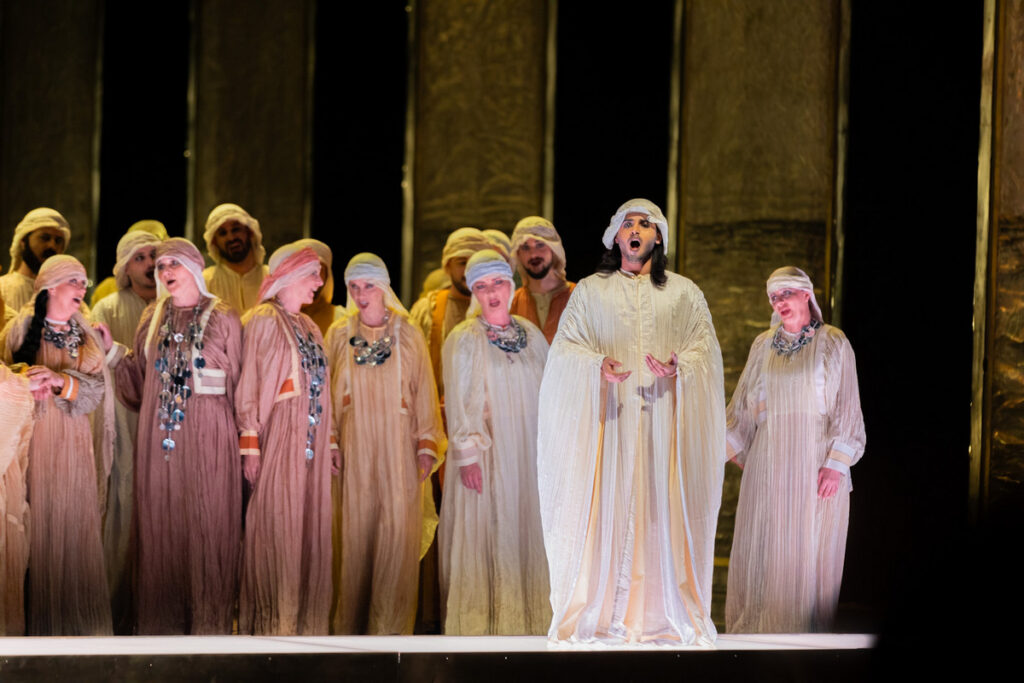 Pěvci byli jen tři domácí, tenorista Khayran Al Zahrani a sopranistky Sawsan Albahti a Reemaz Oqbi. Titulní roli ztvárnila anglická mezzosopranistka světové pověsti Sarah Connolly, dále účinkovali Amelia Wawrzon, Serena Farnocchia, Paride Cataldo, Aleksandar Stefanoski a George von Bergen.