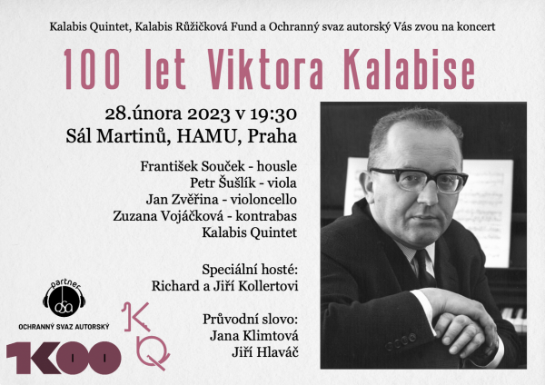 „Dnes, v pondělí 27. února, si připomeneme sté výročí narození českého hudebního skladatele Viktora Kalabise. K této příležitosti připravil Nadační fond Viktora Kalabise a Zuzany Růžičkové, založený samotným skladatelem a jeho manželkou, speciální projekt nazvaný Kalabis100, který zahrnuje více než čtyřicet koncertů a doprovodných akcí, včetně publikace skladeb a vydání zvukových nahrávek,“ uvádějí pořadatelé s tím, že nejen po celém Česku, ale i v zahraničí tak letos probíhá řada kulturních událostí, které si kladou za cíl, připomenout a oslavit život a dílo tohoto významného umělce. Jednou z nich je také slavnostní koncert dechového kvinteta Kalabis Quintet, který se bude konat den po skladatelových nedožitých stých narozeninách, tedy 28. února v Sále Martinů na pražské HAMU. V sále pojmenovaném po Bohuslavovi Martinů, jednom z nejvýznamnějších inspiračních zdrojů pro Viktora Kalabise, tak zazní výběr z jeho komorní tvorby. Kalabis Quintet provede spolu s hosty, Zuzanou Vojáčkovou, Františkem Součkem, Petrem Šušlíkem a Janem Zvěřinou skladby Malou komorní hudbu, op. 27, Divertimento, op. 10, Klasický nonet, op. 13 a Nonet č. 2, „Pocta přírodě“, op. 44. Jako speciální host se představí Richard Kollert, který v den svých 15. narozenin přednese Kalabisovo Hallelujah. Psalm 150 pro housle a klavír, op. 74.