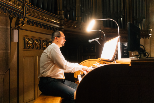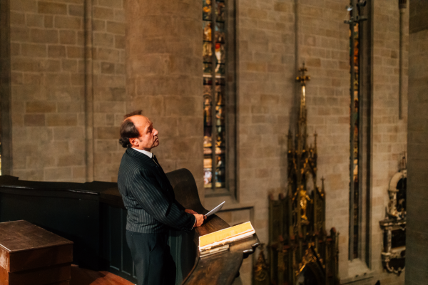 „Katedrální varhaník Aleš Nosek si své provedení náročného Preludia a fugy e moll Johanna Sebastiana Bacha doslova užil.“