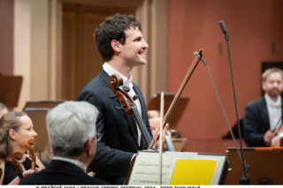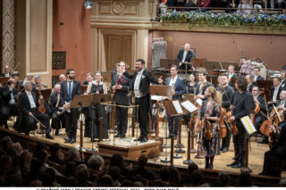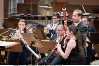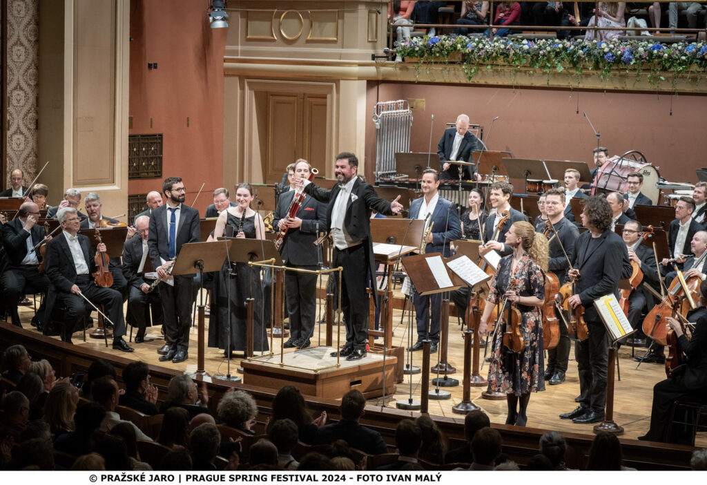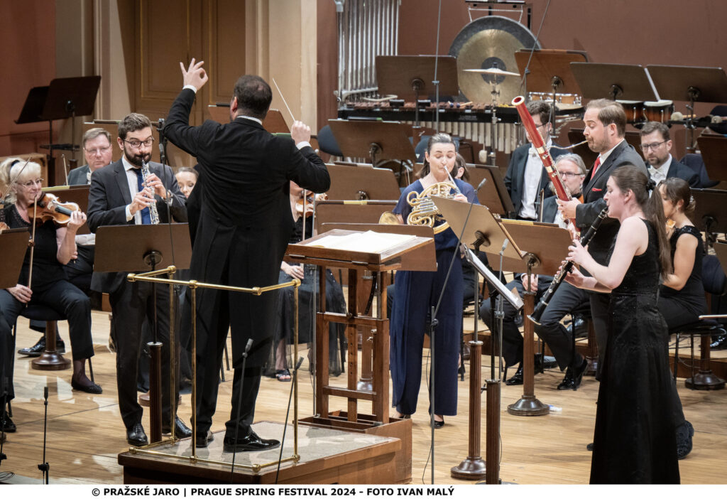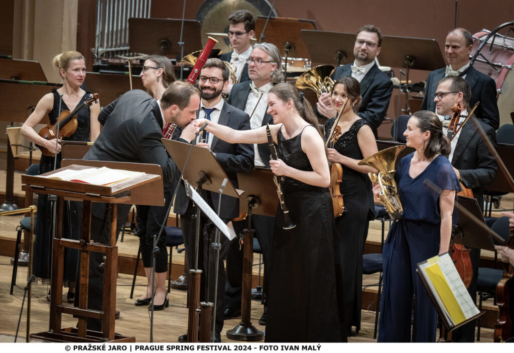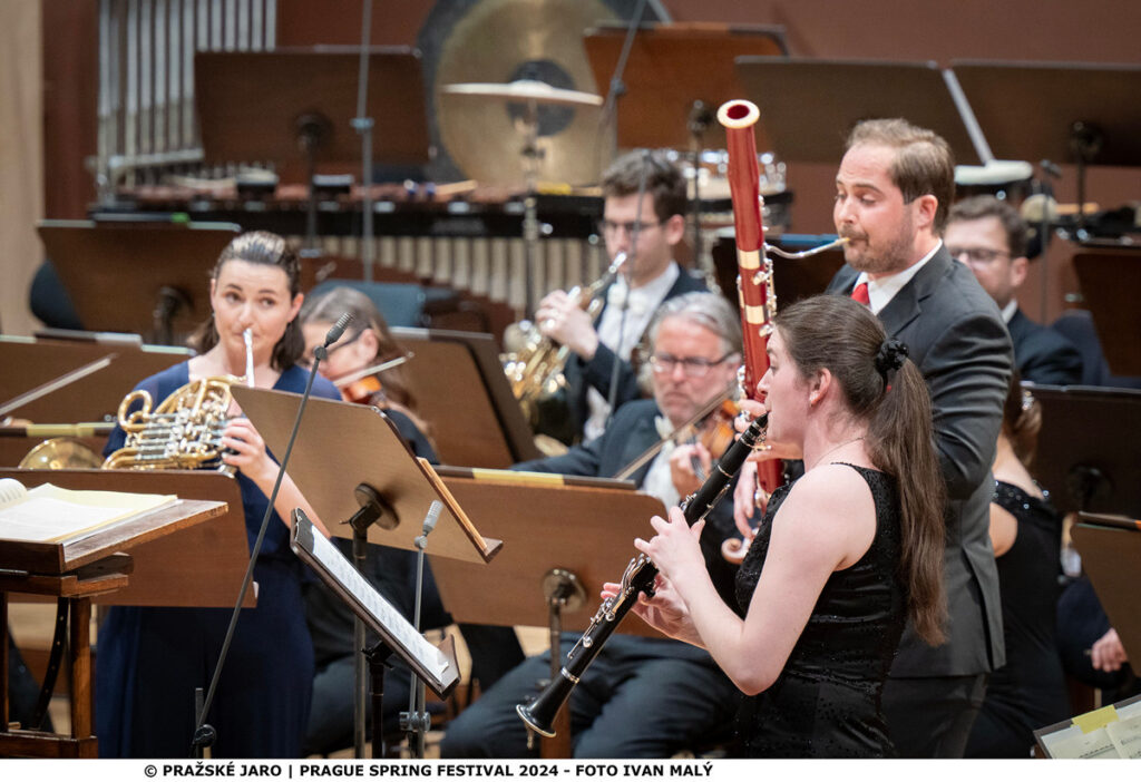 Dramaturgie Pražského jara rudolfinský pořad vystavěla sympaticky uceleně – večer rámovaly zmíněné premiéry, v první půli vystoupili přední sólisté sami, po přestávce pak zase jiní, na rozdílné nástroje a po skupinách. Přišla tedy na řadu Koncertantní symfonie pro hoboj, klarinet, fagot a lesní roh a orchestr Es dur, KV 297b, u níž se vedou spory, zda skutečně náleží Mozartovi – a jako že spíše ne. Obsazení bylo hvězdné, opět sestávalo z minulých laureátů: Johannes Grosso (hoboj), Anna Paulová (klarinet), Jan Hudeček (fagot) a Kateřina Javůrková (lesní roh). A hned s prvními tóny bylo jasné, s kým máme tu čest: úvodní unisoso všech sólistů bylo až neskutečně intonačně jednotné. A kultivovanost hry trvala po celou dobu půlhodinové kompozice. V této souvislosti – a když už byla „nakousnuta“ dramaturgie – si kladu otázku, proč koncertní setkání zahájilo až ve dvacet hodin, když čistý čas hudebního děje nešel pod hodinu čtyřicet. Do Rudolfina se obvykle chodí na půl osmou; vedle sedící mládež „to zabalila“ v průběhu druhé půle… Ale zpět. Skutečně hodna obdivu byla maximální péče o tón jednoho každého z protagonistů „Mozartovy“ skladby, galantně noblesní projev se úzkostně pečlivě staral i o dynamické odstíny, k tomu příjemný vizuál, kdy každý z hráčů nabízel tanci ne nepodobný pohybový doprovod hry. Přes elán všech zúčastněných se však nebylo možné ubránit pocitu, že o něco kratší kus by koncertnímu večeru prospěl. Určitou ztrátu tahu však zapříčinila jistě i sama kompozice, která mnohne invencí zrovna neplýtvá. Dvě klanění.