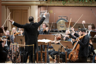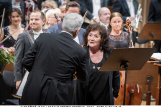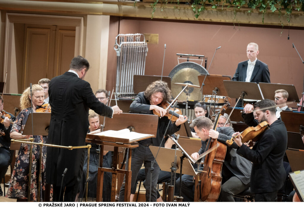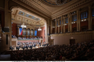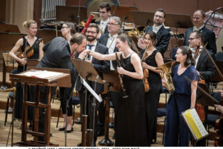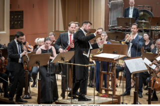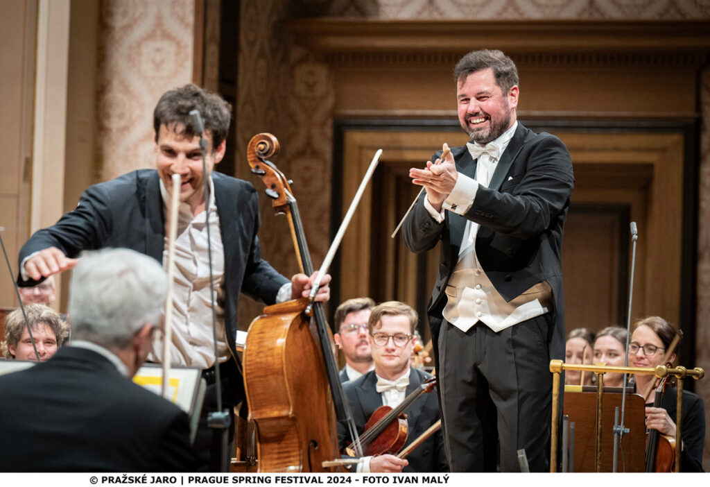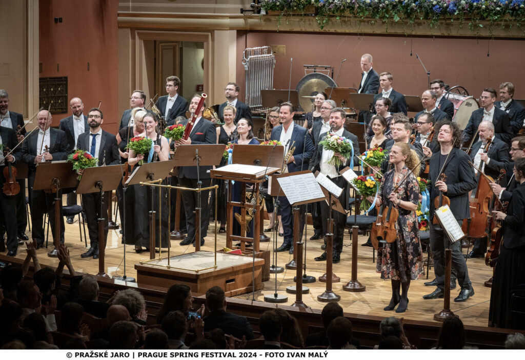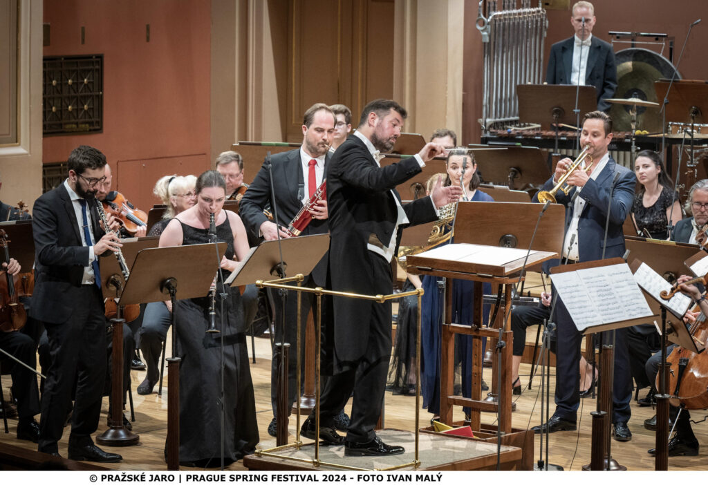 Dramaturgie Pražského jara rudolfinský pořad vystavěla sympaticky uceleně – večer rámovaly zmíněné premiéry, v první půli vystoupili přední sólisté sami, po přestávce pak zase jiní, na rozdílné nástroje a po skupinách. Přišla tedy na řadu Koncertantní symfonie pro hoboj, klarinet, fagot a lesní roh a orchestr Es dur, KV 297b, u níž se vedou spory, zda skutečně náleží Mozartovi – a jako že spíše ne. Obsazení bylo hvězdné, opět sestávalo z minulých laureátů: Johannes Grosso (hoboj), Anna Paulová (klarinet), Jan Hudeček (fagot) a Kateřina Javůrková (lesní roh). A hned s prvními tóny bylo jasné, s kým máme tu čest: úvodní unisoso všech sólistů bylo až neskutečně intonačně jednotné. A kultivovanost hry trvala po celou dobu půlhodinové kompozice. V této souvislosti – a když už byla „nakousnuta“ dramaturgie – si kladu otázku, proč koncertní setkání zahájilo až ve dvacet hodin, když čistý čas hudebního děje nešel pod hodinu čtyřicet. Do Rudolfina se obvykle chodí na půl osmou; vedle sedící mládež „to zabalila“ v průběhu druhé půle… Ale zpět. Skutečně hodna obdivu byla maximální péče o tón jednoho každého z protagonistů „Mozartovy“ skladby, galantně noblesní projev se úzkostně pečlivě staral i o dynamické odstíny, k tomu příjemný vizuál, kdy každý z hráčů nabízel tanci ne nepodobný pohybový doprovod hry. Přes elán všech zúčastněných se však nebylo možné ubránit pocitu, že o něco kratší kus by koncertnímu večeru prospěl. Určitou ztrátu tahu však zapříčinila jistě i sama kompozice, která mnohne invencí zrovna neplýtvá. Dvě klanění.