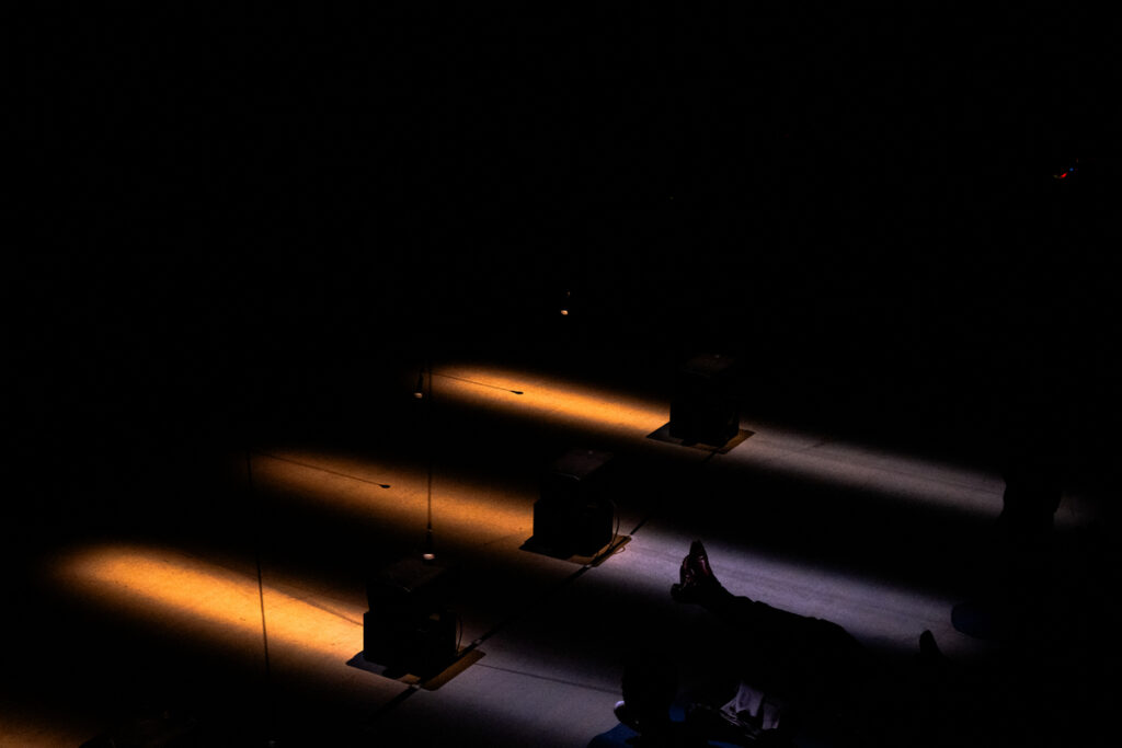 Obdobným způsobem zdejší prostředí příznivě vyhovuje i vizuální stránce produkce. Je zde možné navodit absolutní tmu, rušenou pouze nezbytnou světelnou bezpečnostní a evakuační signalizací. Světelná designérka Barbora Jágrová tedy měla značně usnadněnu práci při realizaci svých decentních kreací. Pro koncert bylo specificky uzpůsobeno vybavení haly. Proti necelý metr vyvýšenému prostornému pódiu byla na protilehlé straně haly umístěna všechna elektrická, elektronická i ovládací zařízení, a nebylo jich málo. Čtyřem kyvadlům byl vyčleněn centrální prostor, obklopený polštáři a textilními lehátky, což nabídlo nejen pohodlné spočinutí pro většinu meditujících posluchačů, ale i dodatečné akustické utlumení. Pro zbytek publika byly u stěn umístěny řady sedadel, která umožňovala dostatečný přehled po veškerém dění v sále.