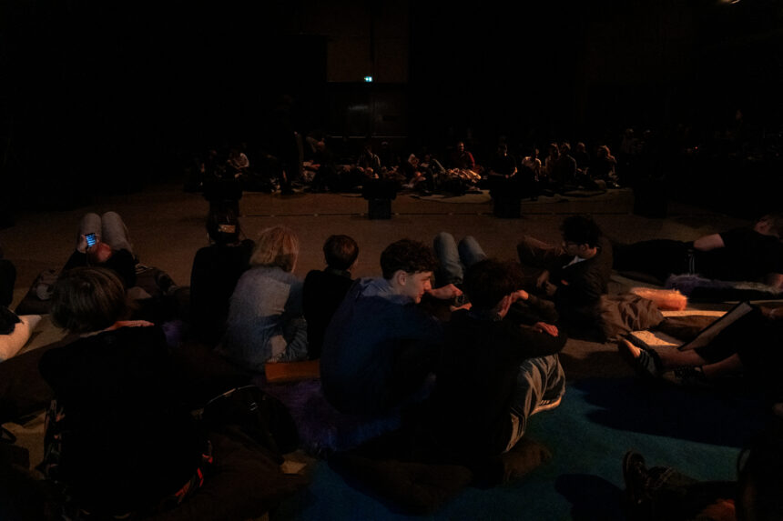 Obdobným způsobem zdejší prostředí příznivě vyhovuje i vizuální stránce produkce. Je zde možné navodit absolutní tmu, rušenou pouze nezbytnou světelnou bezpečnostní a evakuační signalizací. Světelná designérka Barbora Jágrová tedy měla značně usnadněnu práci při realizaci svých decentních kreací. Pro koncert bylo specificky uzpůsobeno vybavení haly. Proti necelý metr vyvýšenému prostornému pódiu byla na protilehlé straně haly umístěna všechna elektrická, elektronická i ovládací zařízení, a nebylo jich málo. Čtyřem kyvadlům byl vyčleněn centrální prostor, obklopený polštáři a textilními lehátky, což nabídlo nejen pohodlné spočinutí pro většinu meditujících posluchačů, ale i dodatečné akustické utlumení. Pro zbytek publika byly u stěn umístěny řady sedadel, která umožňovala dostatečný přehled po veškerém dění v sále.