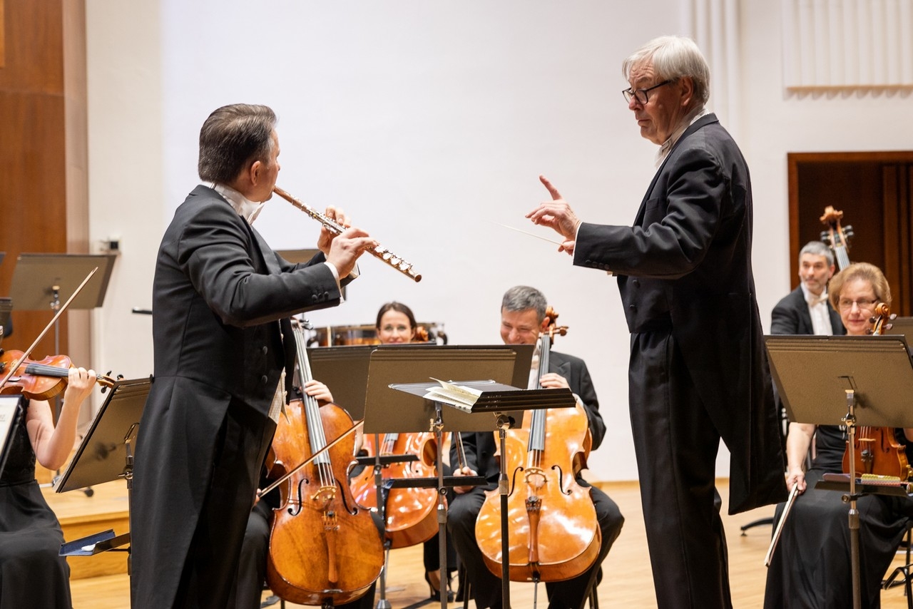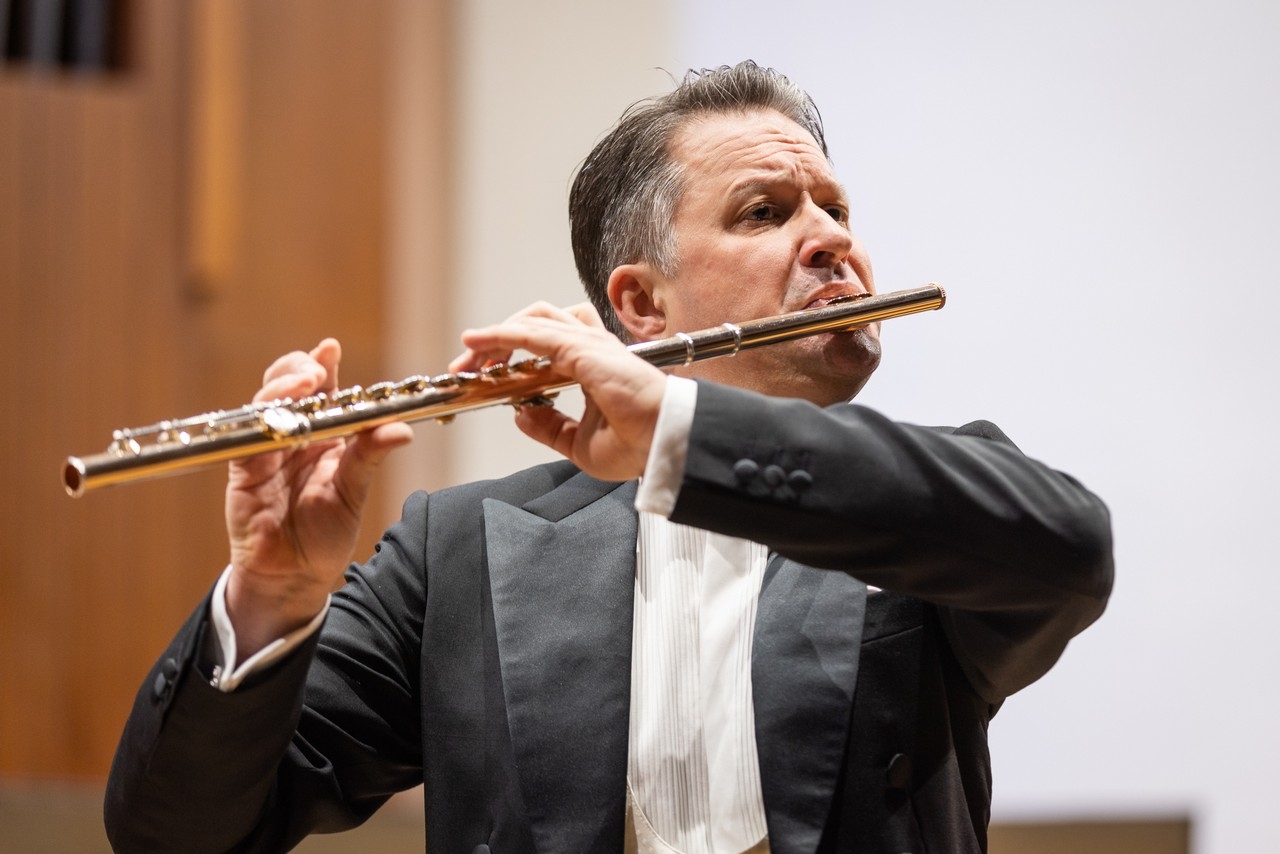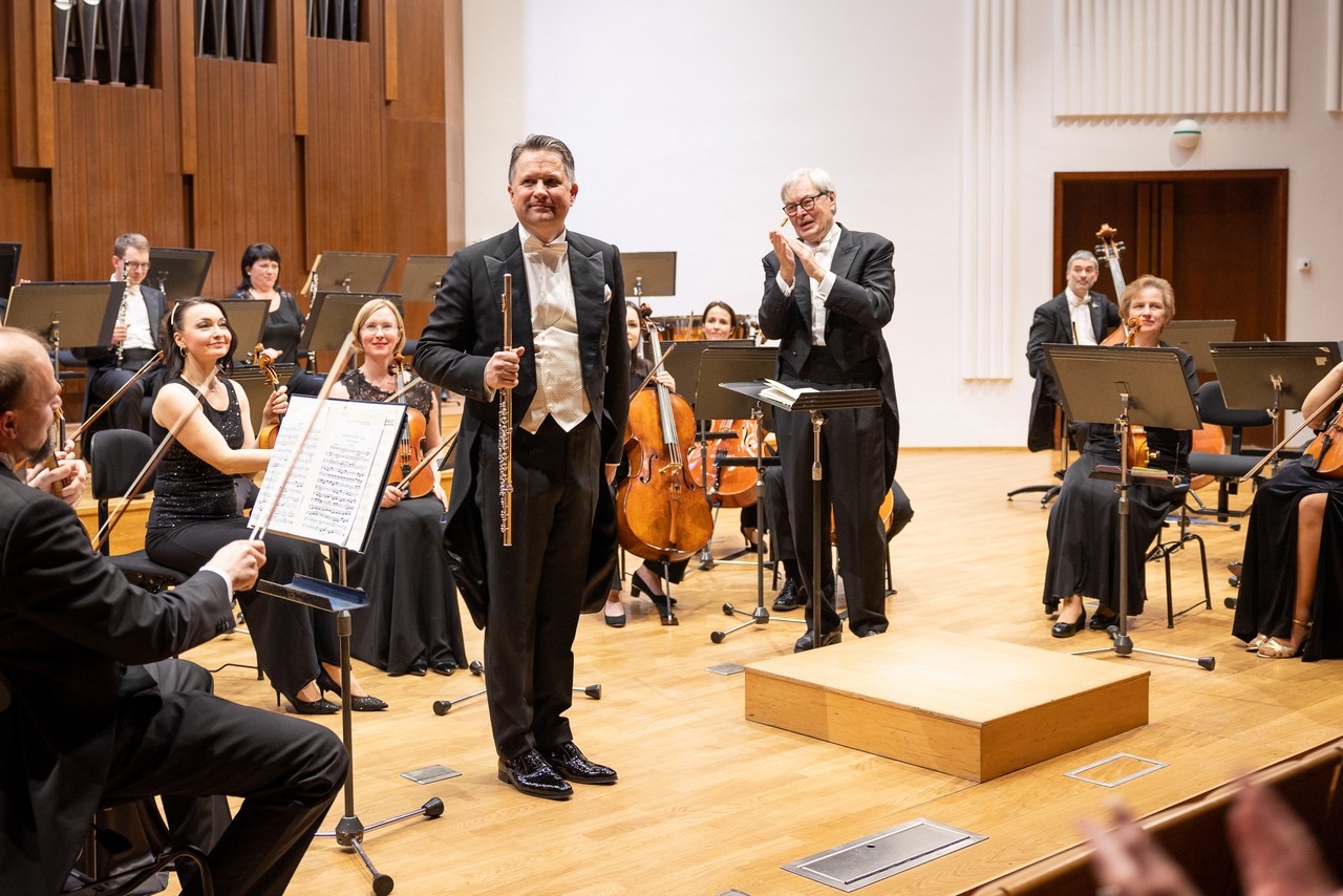 V následujícím Koncertu pro flétnu a orchestr č. 1 G dur Wolfganga Amadea Mozarta zazářil Jan Ostrý. Tento koncert patří k nejznámějším, nejčastěji hraným a snad k nejlepším ve flétnové literatuře vůbec. Sólista hrál zpaměti a byl vidět velký nadhled, který nad dílem měl. Nespokojil se pouze s rovným postojem situovaným v jednom místě, ale různě se otáčel a snižoval i vyvyšoval, jak to flétnisté dělají. Po celou dobu jeho tón jasně zářil nad orchestrem, který jej nikdy nepřekryl. V každé ze tří vět předvedl náročnou a dlouhým trylkem zakončenou sólovou kadenci. Po tomto brilantním provedení zařadil ještě sólistický přídavek – Syrinx od Clauda Debussyho, který byl plný dlouhých tónů dokazujících sólistův vynikající dech. K předchozí skladbě vytvořil znamenitý kontrast. Orchestr hrál v tomto případě z ryze praktických důvodů v komornějším obsazení – pouze s jedním kontrabasem a tak dále.