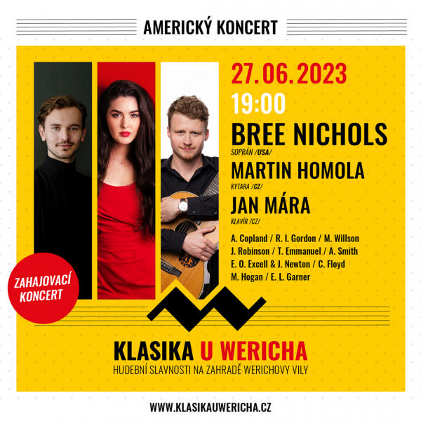 Třetí ročník hudebních slavností Klasika u Wericha, které se odehrávají na zahradě a v podkroví Werichovy vily na pražské Kampě, letos programově míří do Ameriky a Velké Británie. V úterý 27. června je hudebně odstartuje sopranistka Bree Nichols a „finger-style“ sólový kytarista Martin Homola. Za klavír zasedne mladý dirigent a klavírista Jan Mára.