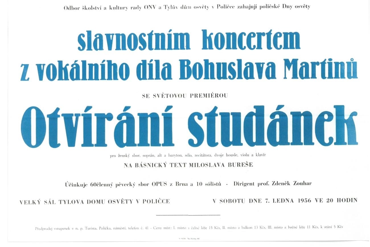 Komorní kantáta Otvírání studánek je prostá vokální skladba, v níž se díky básníkovi Miloslavu Burešovi skladatel Bohuslav Martinů vrátil v myšlenkách domů tak intimně, že si ji Češi zamilovali z jeho tvorby asi úplně nejvíc. Vznikla v létě roku 1955 v Nice na jihu Francie. Text o jarních zvycích a o hluboké sounáležitosti s tradicemi, přírodou, předky a domovem obdržel skladatel nedlouho předtím a zhudebnil ho velmi rychle. Předpremiéra kouzelného díla se konala hned toho roku v prosinci v Praze. A sedmého ledna teď uplynulo pětašedesát let od oficiální světové premiéry, která byla v Poličce.