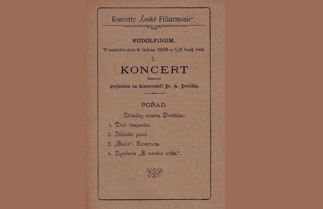 Program prvního koncertu České filharmonie tvořily v lednu 1896 výhradně Dvořákovy skladby. Třetí slovanská rapsodie, předehra Othello a Novosvětská symfonie a ve světové premiéře první pětice z desetidílného cyklu Biblické písně. Antonín Dvořák, kdysi v době kapelnického působení Bedřicha Smetany violista v orchestru Prozatímního divadla a také varhaník u svatého Vojtěcha, byl už teď vůdčí osobností domácí hudební scény. Měl za sebou osm cest do Británie a pedagogické působení v New Yorku, měl čestný doktorát pražské univerzity a byl čestným doktorem i na univerzitě v Cambridge. Jeho umění získalo svrchovanou jistotu ve zvládnutí hrnoucí se invence do dokonale řešených hudebních forem. Na jeho umělecké výsledky šťastně zapůsobilo ukotvení ve zdravé muzikalitě, upřímné emocionalitě a slovanské vřelosti i melancholii a stavění na svěžích melodických nápadech blízkých typu lidové české hudebnosti.